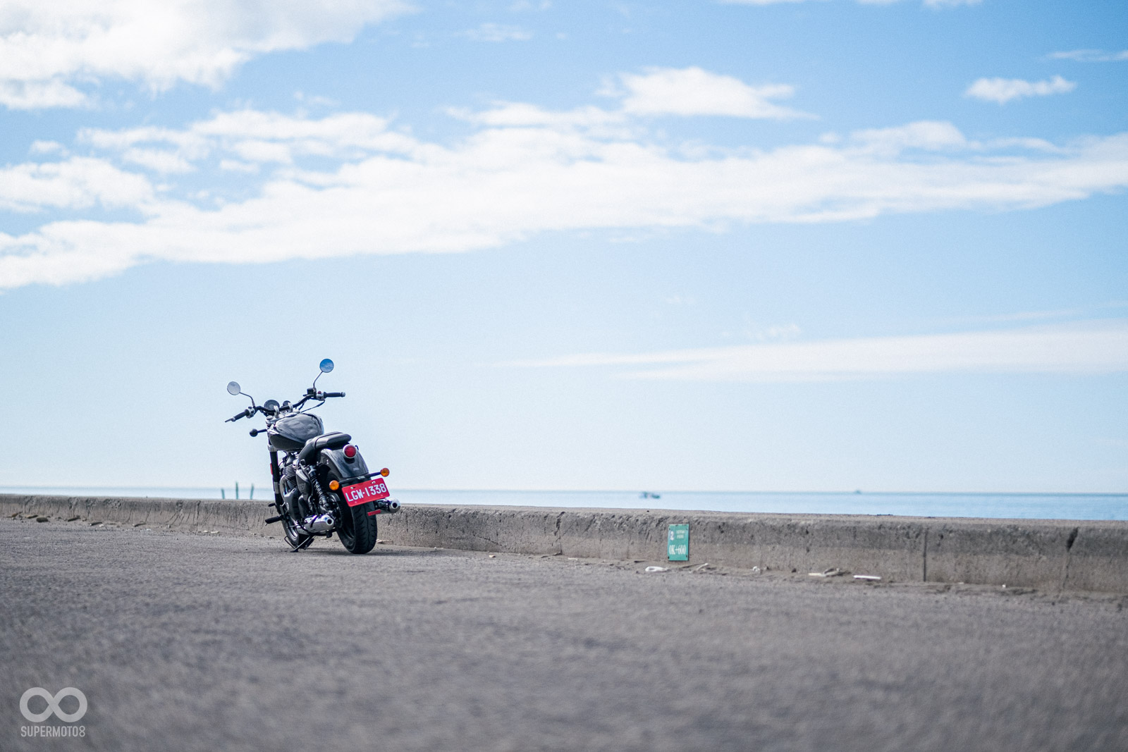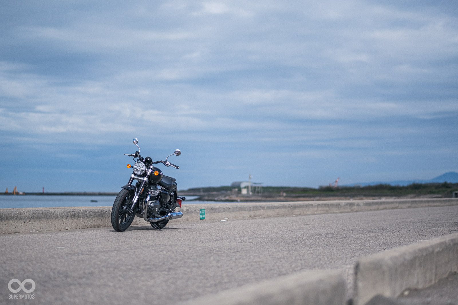 沿著西濱一路向南,我們來到了竹圍漁港附近的知名景點「豬鼻子海灘」,為了抵達這個拍攝點,我們必須離開平坦的快速道路,鑽入錯綜複雜的鄉間小路與海堤道路,這裡的路幅極窄,對於長軸距的巡航車來說本應是個挑戰,但 Super Meteor 650 再度展現了其親民的一面。