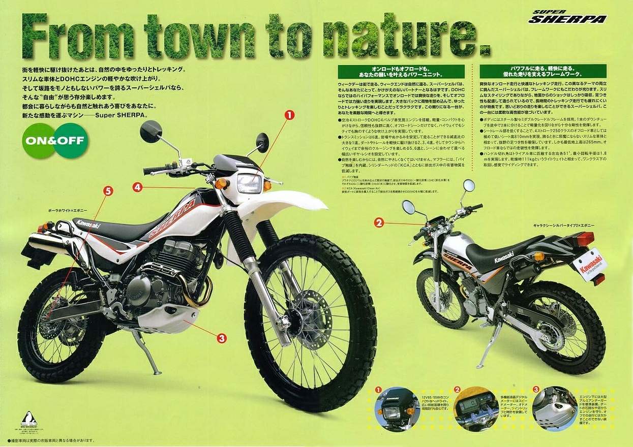 1997 年,Kawasaki 為了挑戰 Yamaha 的壟斷地位,推出了規格驚人的 Super Sherpa,它搭載了同級唯一的 DOHC 4 氣門氣冷引擎,最大馬力達到 26ps,並配備了廣域齒比的 6 速變速箱。
