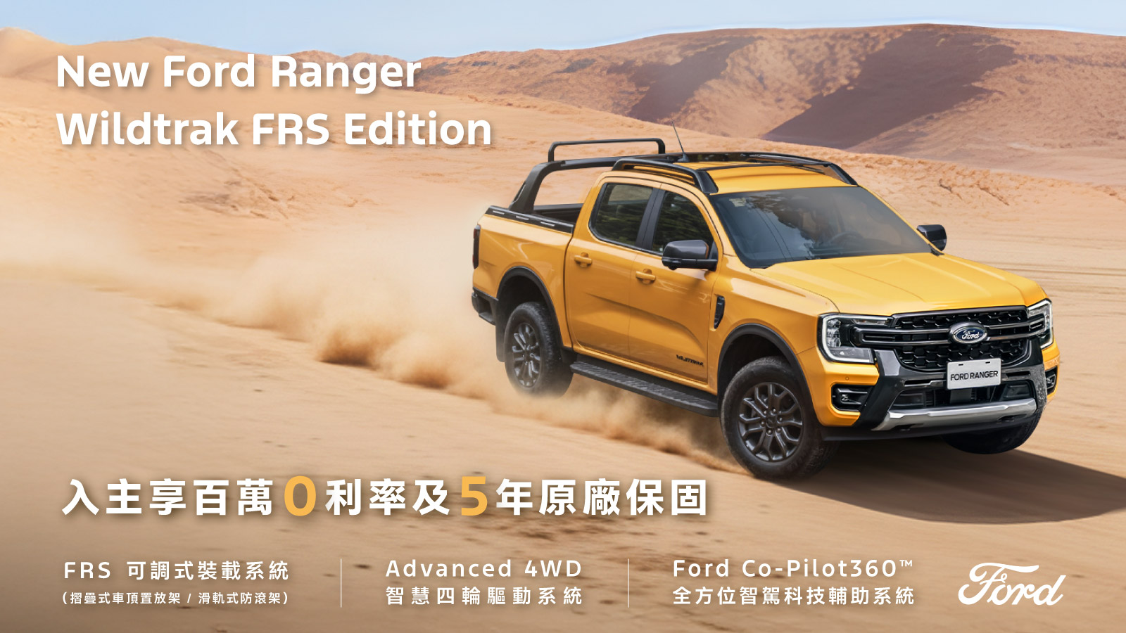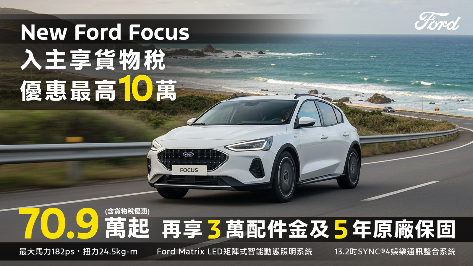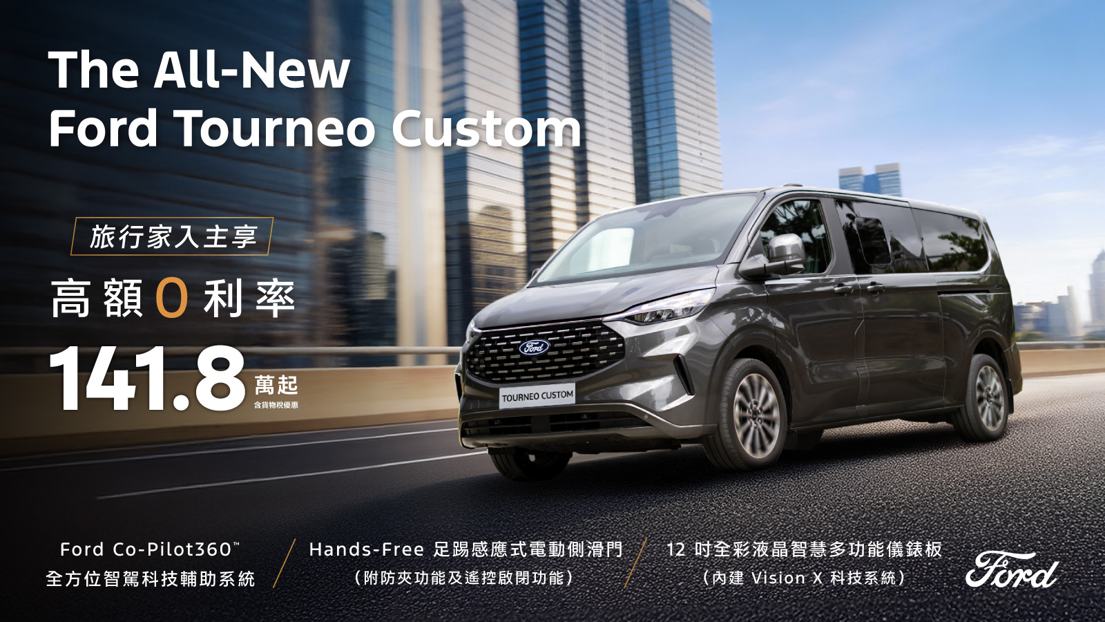 歐洲超能智駕跑旅The All-New Ford Kuga採用1.5T EcoBoost®渦輪增壓汽油引擎,經專屬調校可輸出187ps的強勁動力,動力與操控完美融合,帶來前所未有的駕馭快感,入主即享力挺價83.9萬(含舊換新),再加碼高額分期0利率及5年原廠保固;New Ford Ranger Wildtrak FRS Edition搭載Advanced 4WD智慧四輪驅動系統,可精準判斷全地形路況,智慧調節動力輸出,輕鬆征服各種險峻地形,入主享159.8萬(含舊換新)、百萬0利率及5年原廠保固;New Ford Focus提供多款車型選擇,搭配德規精準底盤調校,帶來靈活操控感受,入主享貨物稅優惠價70.9萬起,再加碼3萬元配件金及5年原廠保固;歐洲進口正七人座New Ford Tourneo Connect福特旅玩家,享貨物稅優惠價109.8萬起,加碼提供百萬0利率及6年不限里程原廠保固〔註四〕;歐洲首選國際商旅The All-New Ford Tourneo Custom福特旅行家,享貨物稅優惠價141.8萬元起,入主再享高額0利率。全方位陣容一次到位,無論是熱血自駕或商務出行,皆能滿足您的多元移動渴望。