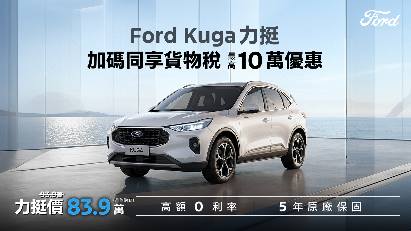 - 註二:The All-New Ford Kuga 1.5T享力挺價83.9萬,係指The All-New Ford Kuga 1.5T Vignale建議售價93.9萬享5萬元力挺購車金,再扣除政府補助舊換新5萬元,詳細資訊請洽Ford經銷商。