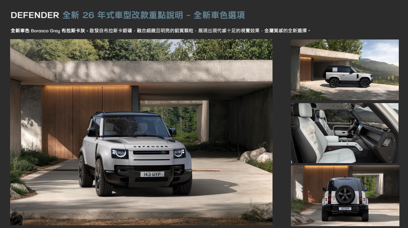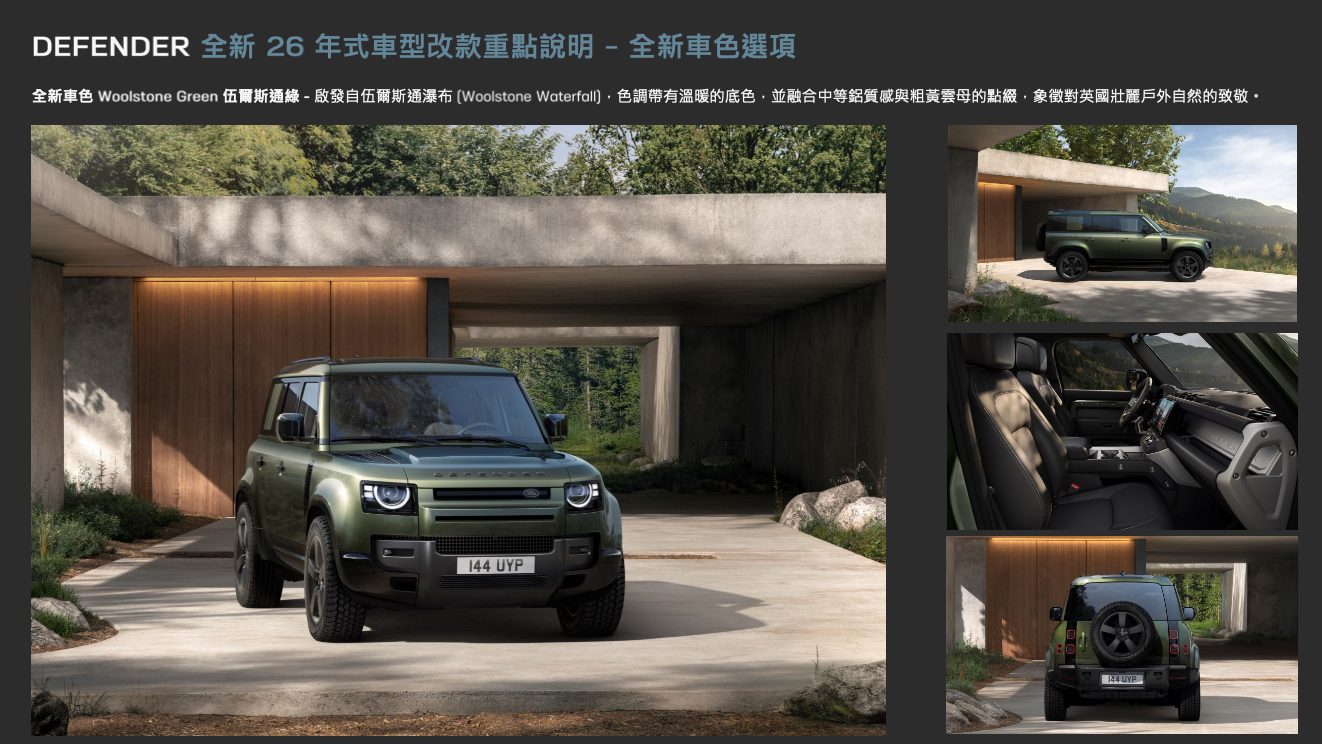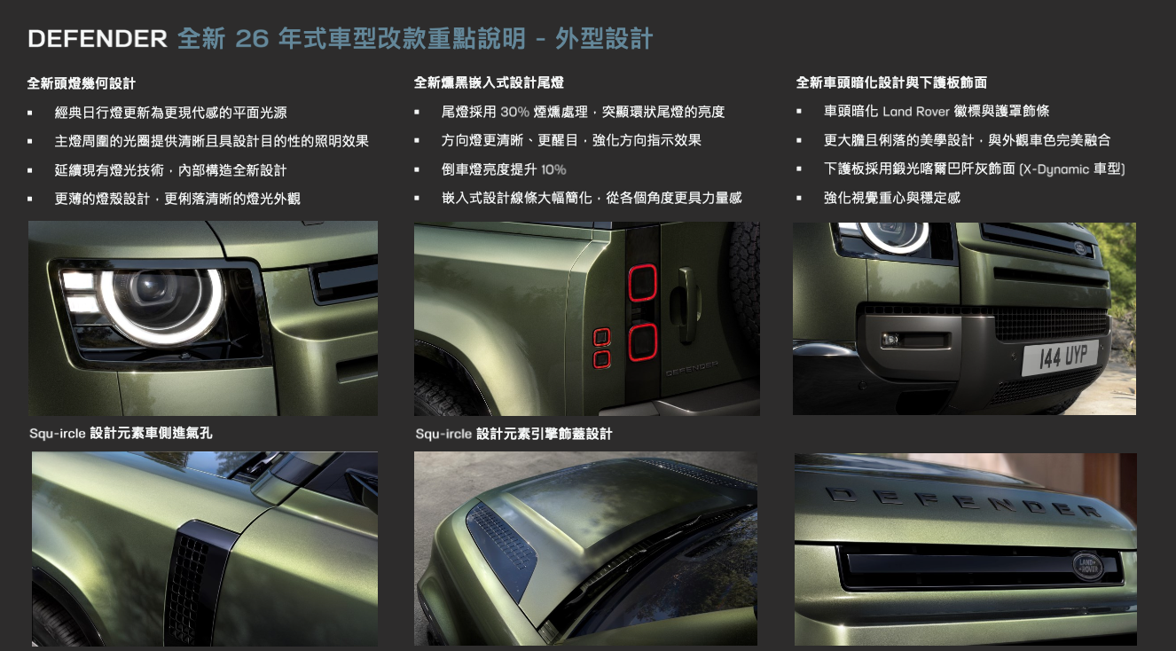 - Defender 經典風格再進化:全新 26 年式 Defender 嶄新改款外型採用全新頭燈與尾燈設計,搭配更加精緻化的細節,以及全新車色與輪圈選項。