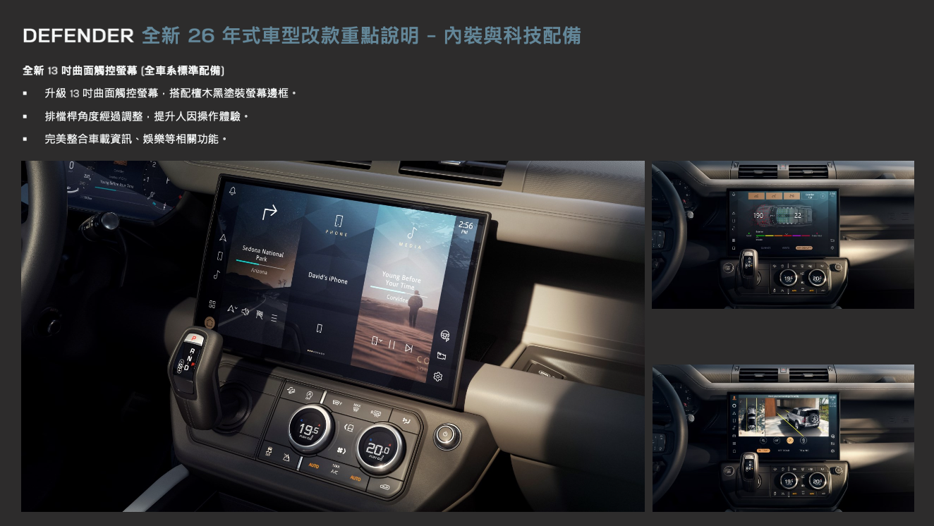 新世代 Defender 迎接問世以來首度改款,設計、精緻度與科技配備全方位進化的全新 26 年式 Defender 正式在台發表。升級項目包含追加導入性能更加強悍的 D350 柴油動力引擎,清晰俐落的全新造型頭燈以及嵌入式燻黑尾燈,以及現代化風格的外觀車色與飾面(包含伍爾斯通綠 Woolstone Green 與布拉斯卡灰 Borasco Grey 兩款全新車色選項),車室內裝則運用更為精緻的細節與頂級材質,搭配尺寸升級至 13.1 吋的曲面觸控螢幕,營造強悍而奢華的野性風格。