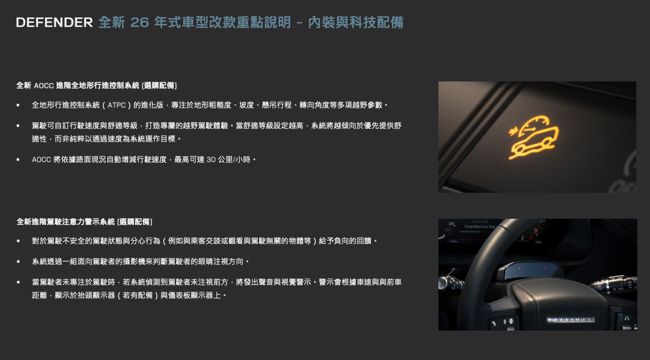 - 領航版優惠升級專屬配備* : 首發限定的全新 26 年式 Defender 領航版,提供限量配備升級優惠,加價 9 萬元即可享有最高價值超過 20 萬元的豐富選購配備:包含抬頭顯示器、Meridian™ 環繞音響系統、電子主動式後軸差速器、水深偵測系統、三區恆溫空調、空氣品質偵測功能、進階車室負離子系統與行李廂電源插座等廣受 Defender 車主喜愛之選配項目。 (*升級配備依據車款選擇有所不同。)