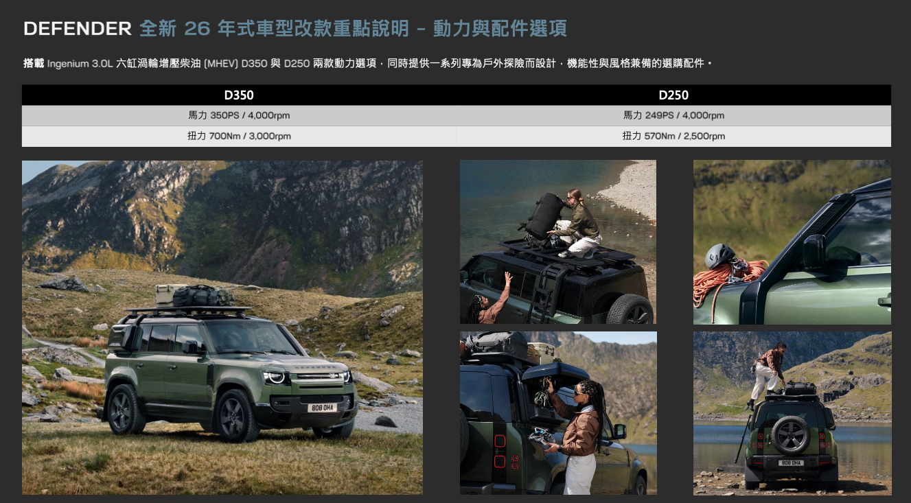 - 豐富多元的探險配件:Defender 專屬的 Explorer、Adventure 與 Urban 配件套件升級優化,讓探險旅程更加精彩。