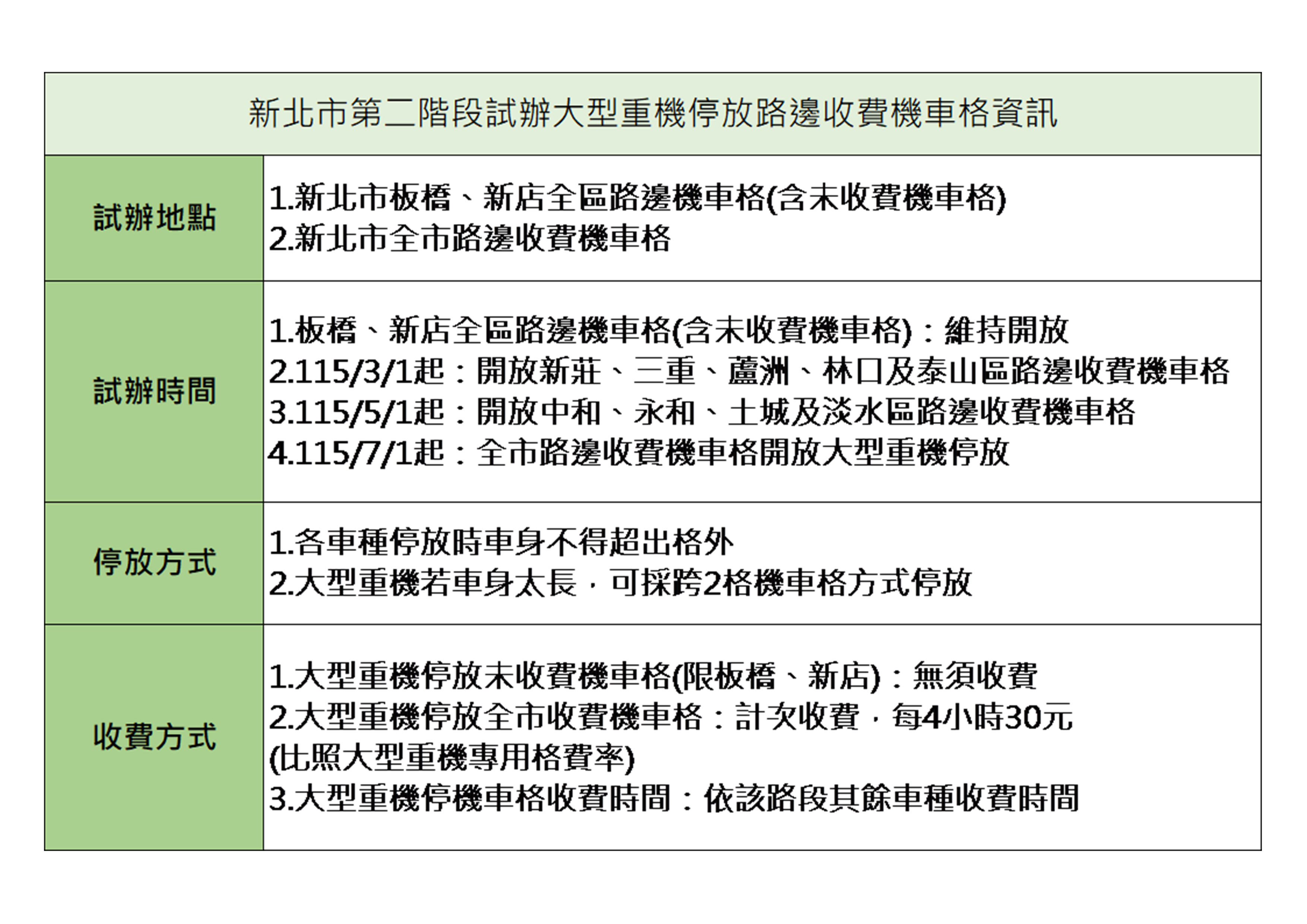 為了解決大型重機的停車困境並提升車格使用效率,新北市交通局宣布自 3 月 1 日起,擴大開放新莊、泰山、林口、三重及蘆洲等 5 個行政區的路邊「收費機車格」供大型重機停放。