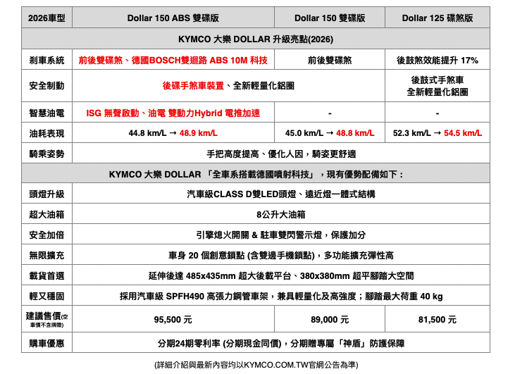 光陽 KYMCO 表示,四年噴射保固獲得正面迴響,也是通路強力推薦與消費者肯定的品牌優勢,光陽2026 年繼新 K1 特仕版以「大滿配新車」大熱銷橫掃市場,另闢市占率成長賽道,推出「超規頂配」的多功能大樂系列,其中 「150 ABS 雙碟版」升級導入「前後雙碟及德國 BOSCH 雙迴路 ABS 安全制動科技」、ISG 無聲啟動及油電雙動力 Hybrid 電推綜效馬力 11.9 ps;8 公升超大油箱與 48.9 km/L 1 級優異油耗表現,在同級距中展現更均衡且更具性價比的產品實力,持續搶攻重視效率與實用性的多功能用車族群,光陽大樂 Dollar 有 150/125 系列,從動力、安全到日常機能全面到位。光陽今(25)日透過新聞稿正式公告大樂新車建議售價與各項優勢配備,預計讓市場四月啟動另一波「多功能二輪換車潮」購買動能,另同步釋出「懶人包資訊」讓消費者快速掌握光陽大樂系列新車特色。