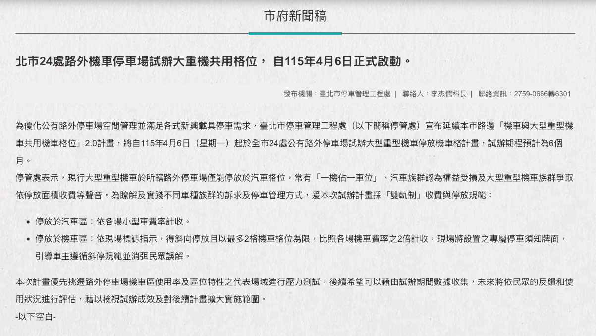 身為重機騎士,最痛苦的莫過於在市區找車位時,明明看到機車格卻不能停,非得去擠那一位難求的汽車位,還得承受汽車駕駛「一機佔一格」的怨念目光,台北市停車管理工程處聽到了廣大騎士的吶喊,宣布自115年4月6日起,將在全市24處公有路外停車場展開為期6個月的試辦計畫,讓大型重型機車正式進駐機車區,這不僅是強化空間管理,更是對多元載具停車權益的正視,讓各位愛車的重機族群在都會區穿梭時,能有更靈活且經濟的停車選擇。