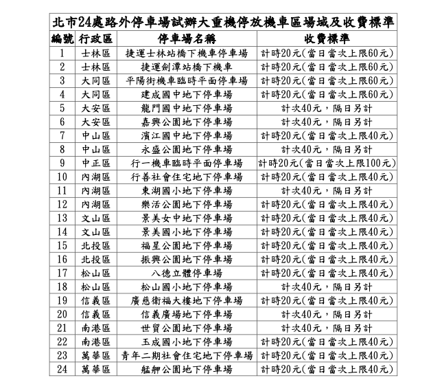 其中,部分場域如中正區的行一機車臨時平面停車場,雖然計時同樣是20元,但上限調整為100元,騎士在進場前建議先看清各場的費率告示;停管處也特別強調,這24處場域是經過壓力測試篩選出的代表性區域,希望能透過這半年的數據收集,作為未來是否推廣至全市公有停車場的重要依據。