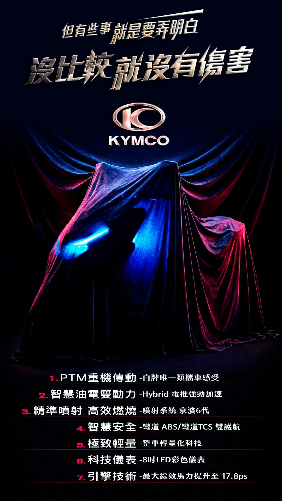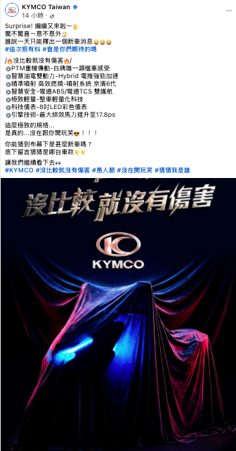 光陽(KYMCO)在愚人節當天於官方社群釋出了一張極具侵略性的新車預告圖。畫面中被紅布蓋住的車身輪廓隱約透露出銳利的車頭線條,與下方列出的七大技術規格,搭配近期不斷的消息曝光,這應該就是光陽今年最受矚目的新車 G7 發表預告。