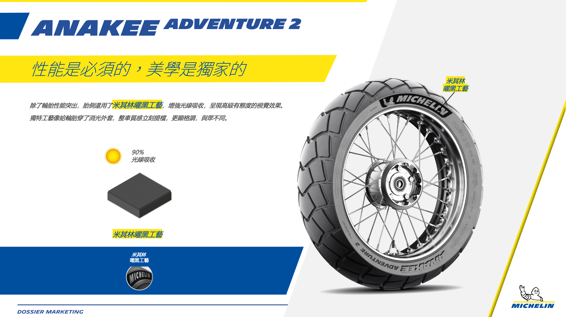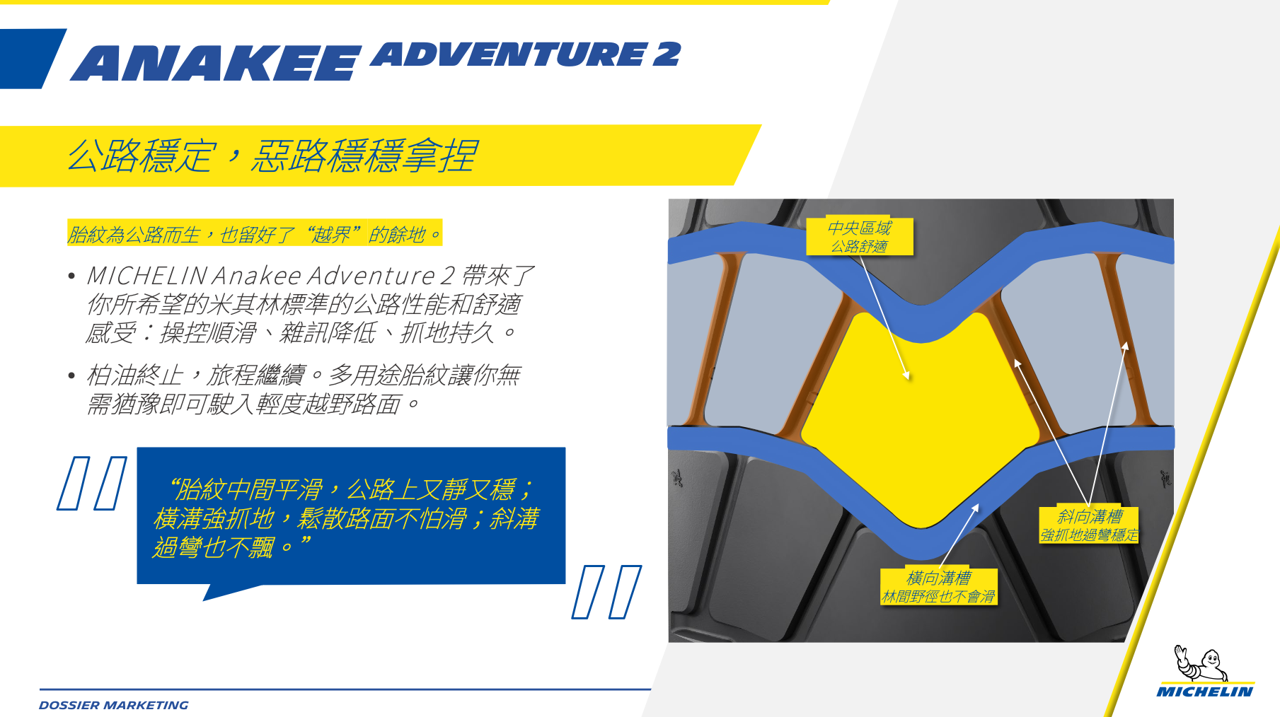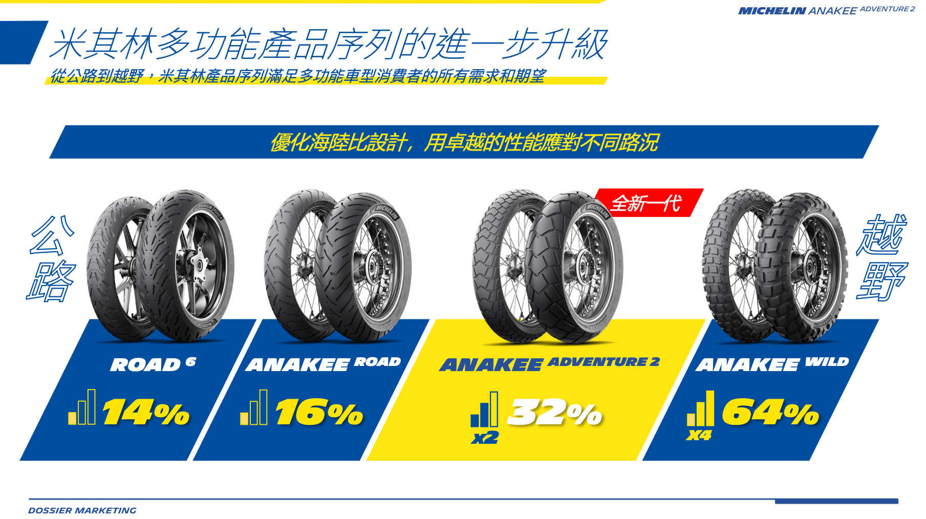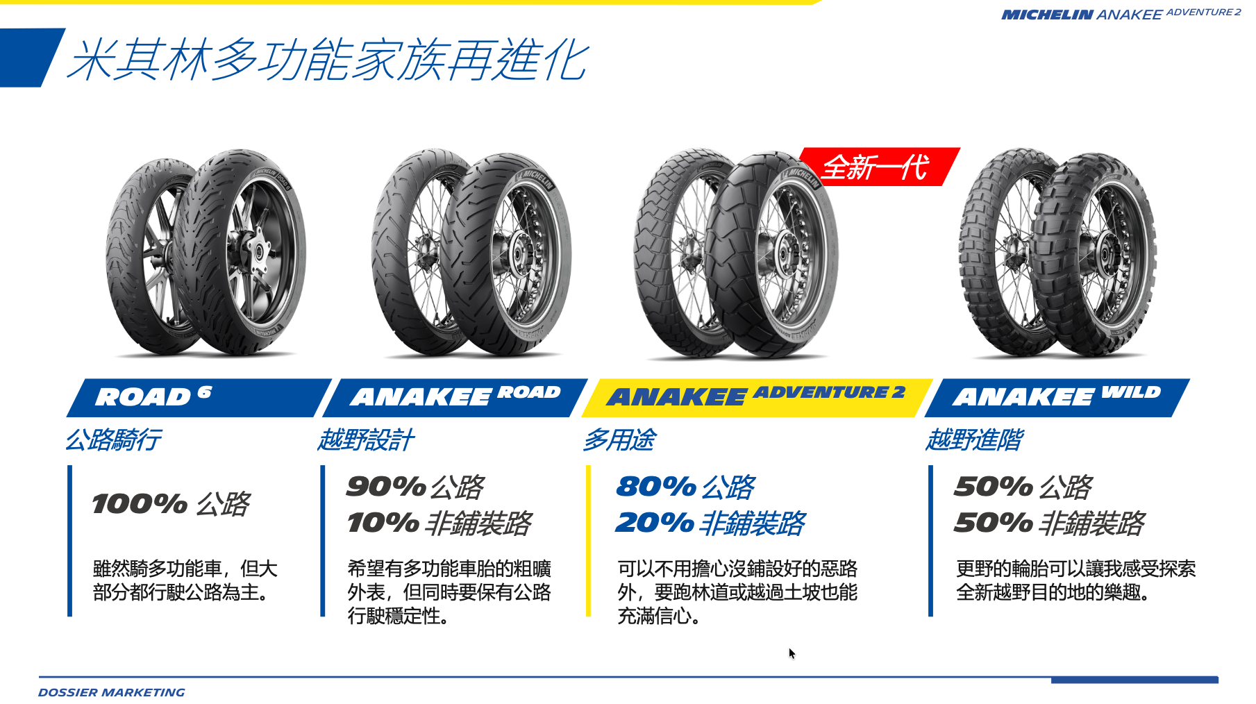 外型設計上,米其林將汽車頂級輪胎常見的「高級絨面觸感設計」導入這款新胎,胎側的細膩觸感與更深邃的黑度,讓輪胎提升了整體的車輛質感;隨著 Anakee Adventure 2 的加入,米其林的多功能車產品矩陣也更趨完整,從 100% 公路導向的 Road 6、90% 公路的 Anakee Road、到本次主角 Anakee Adventure 2,甚至是針對硬核越野的 Anakee Wild,幾乎封死了所有消費者的需求空隙 。