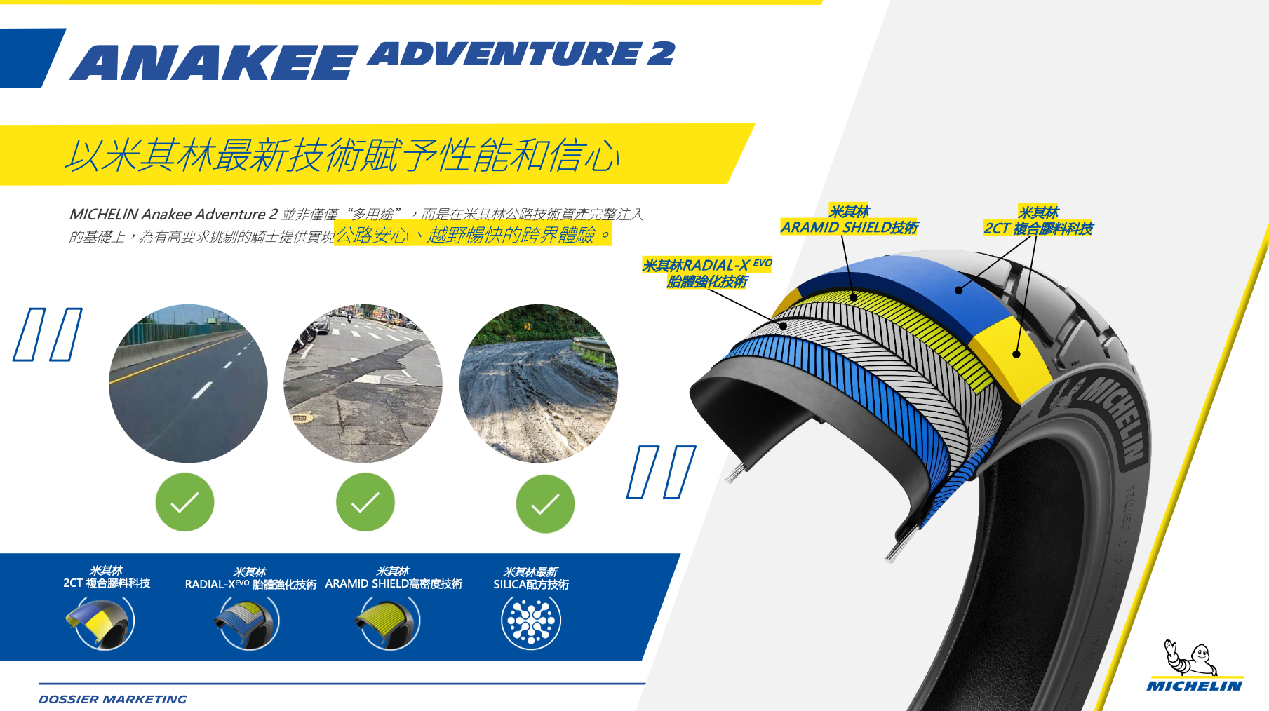 在忠林實業主辦的發表會現場,我們可以清楚看到 Anakee Adventure 2 在技術層面的野心,改款核心在於全方位的性能補強,在材料科學上,米其林換上了新世代的二氧化矽膠料配方,這對台灣變化多端的氣候來說無疑是安全保障。