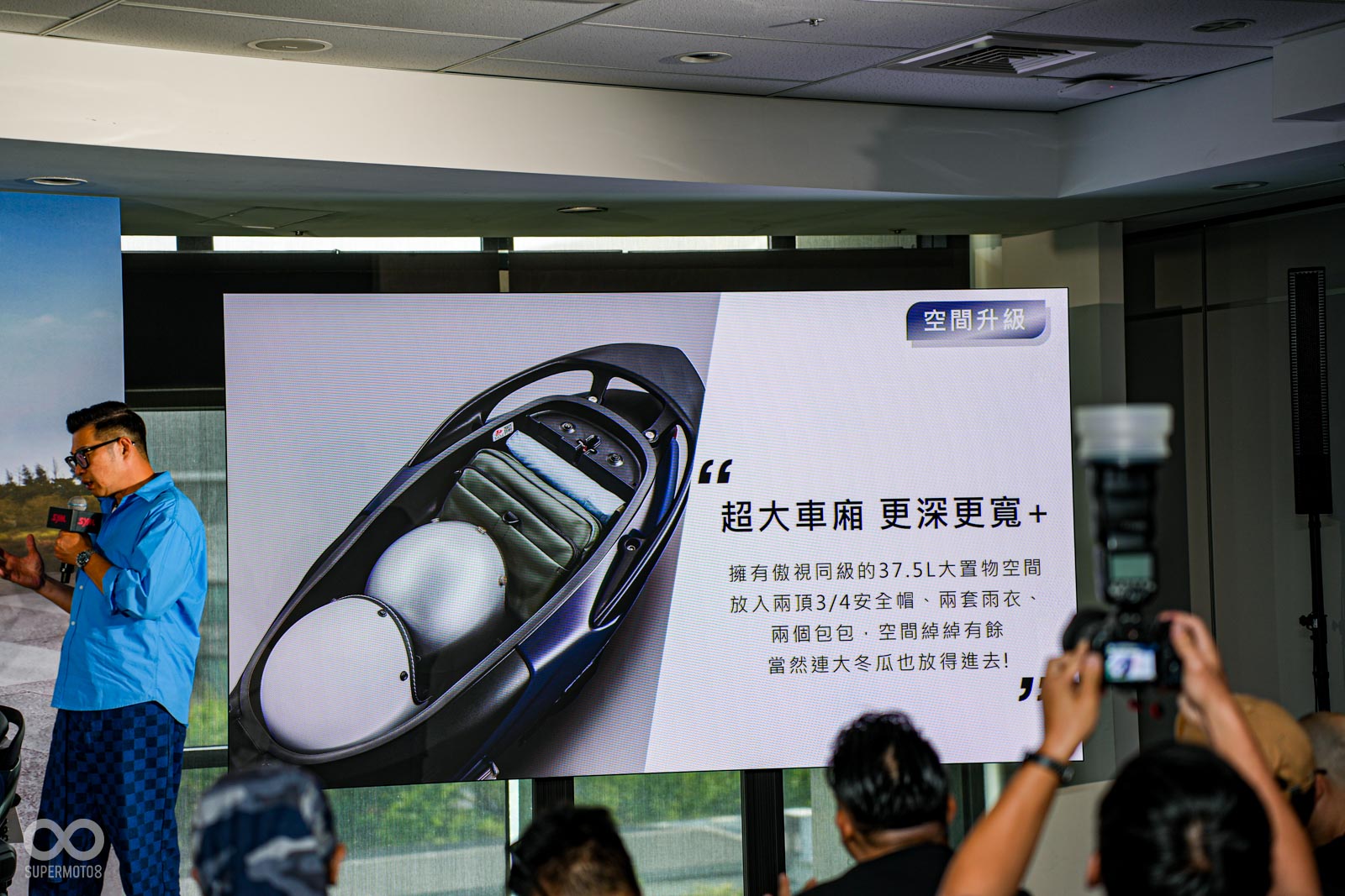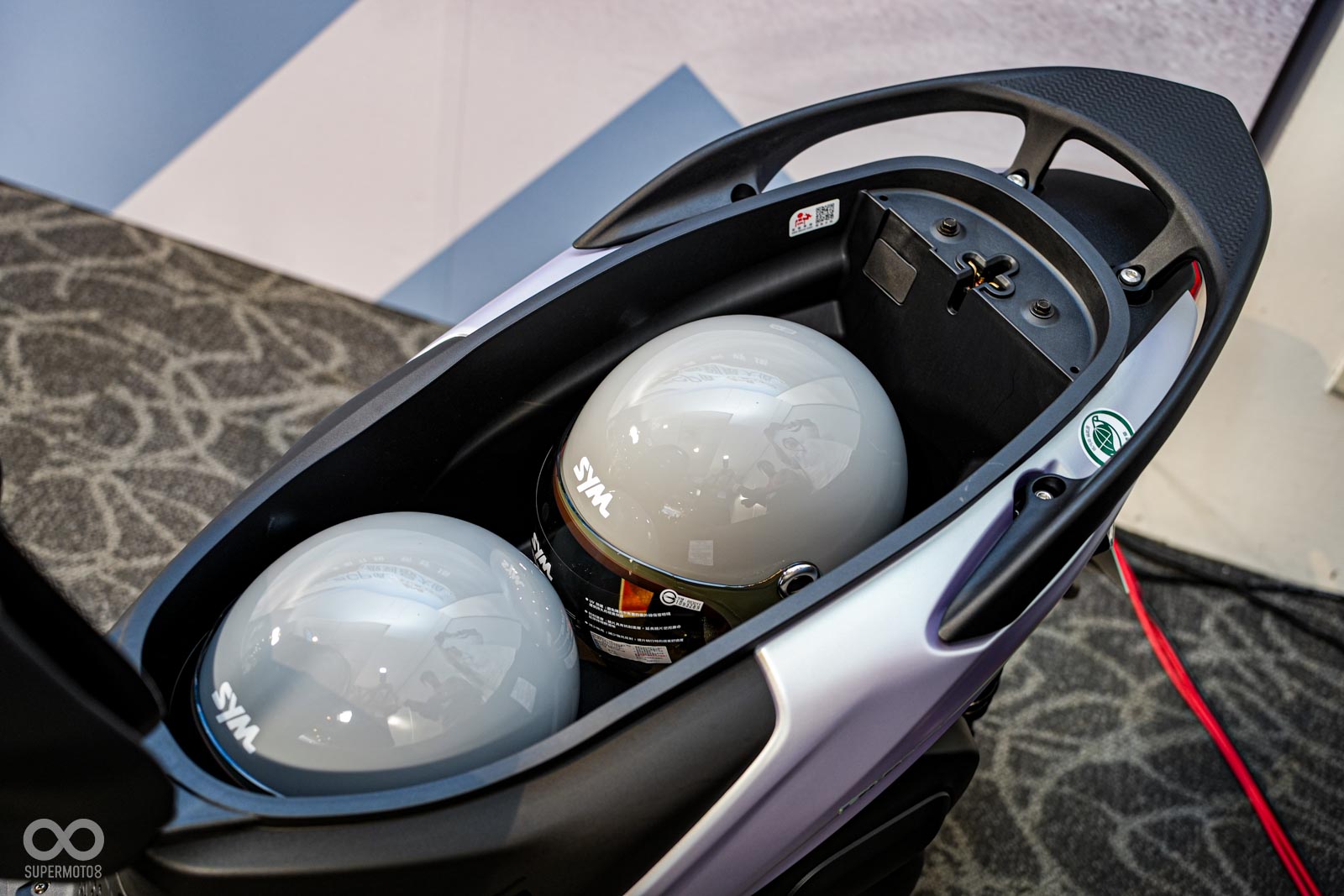 置物空間稱霸同級:車廂容積加大 5.5L 來到 37.5L,不僅能同時放入兩頂 3/4 安全帽,連大冬瓜都放得下。