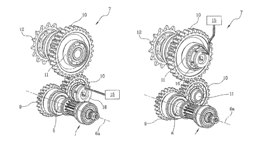 這項專利的核心架構,幾乎就是把 Ducati 的 ICE 哲學直接電動化:一具橫置電動馬達,最高轉速可達驚人的 18,500rpm,接著透過多段齒輪減速後,以傳統鏈條驅動後輪。整個動力傳遞邏輯與一般燃油重機如出一轍,只差在沒有活塞在裡面爆炸。更天才的是,Ducati 解決了電動機車最頭痛的「腰圍問題」:他們將本來安裝在馬達軸上的轉子位置感測器,移到了變速箱齒輪軸上,透過已知的齒輪比反算轉子位置。如此一來,馬達外殼可以做得更纖細,車身也能維持 Ducati 招牌的苗條身形與大仰角入彎能力。