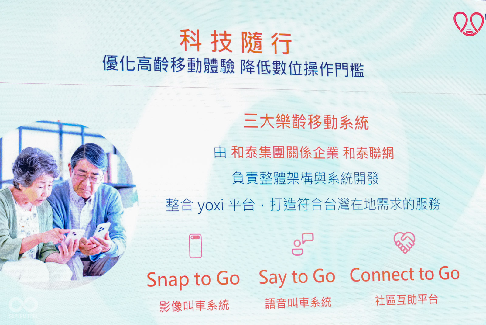 在優化長者移動體驗的「科技隨行」方面,和泰聯網專為長輩開發了直覺化的樂齡移動系統,大幅降低數位落差。未來 yoxi 平台將陸續導入三大創新功能:支援在地口語互動的語音叫車「Say to Go」、拍下門牌即可自動辨識位置的影像叫車「Snap to Go」,以及串聯在地社工與駕駛資源的社區互助平台「Connect to Go」。此外,長年推動的「樂齡行動車」也將擴大偏鄉服務量能,讓長輩能安心且自主地外出參與社交。