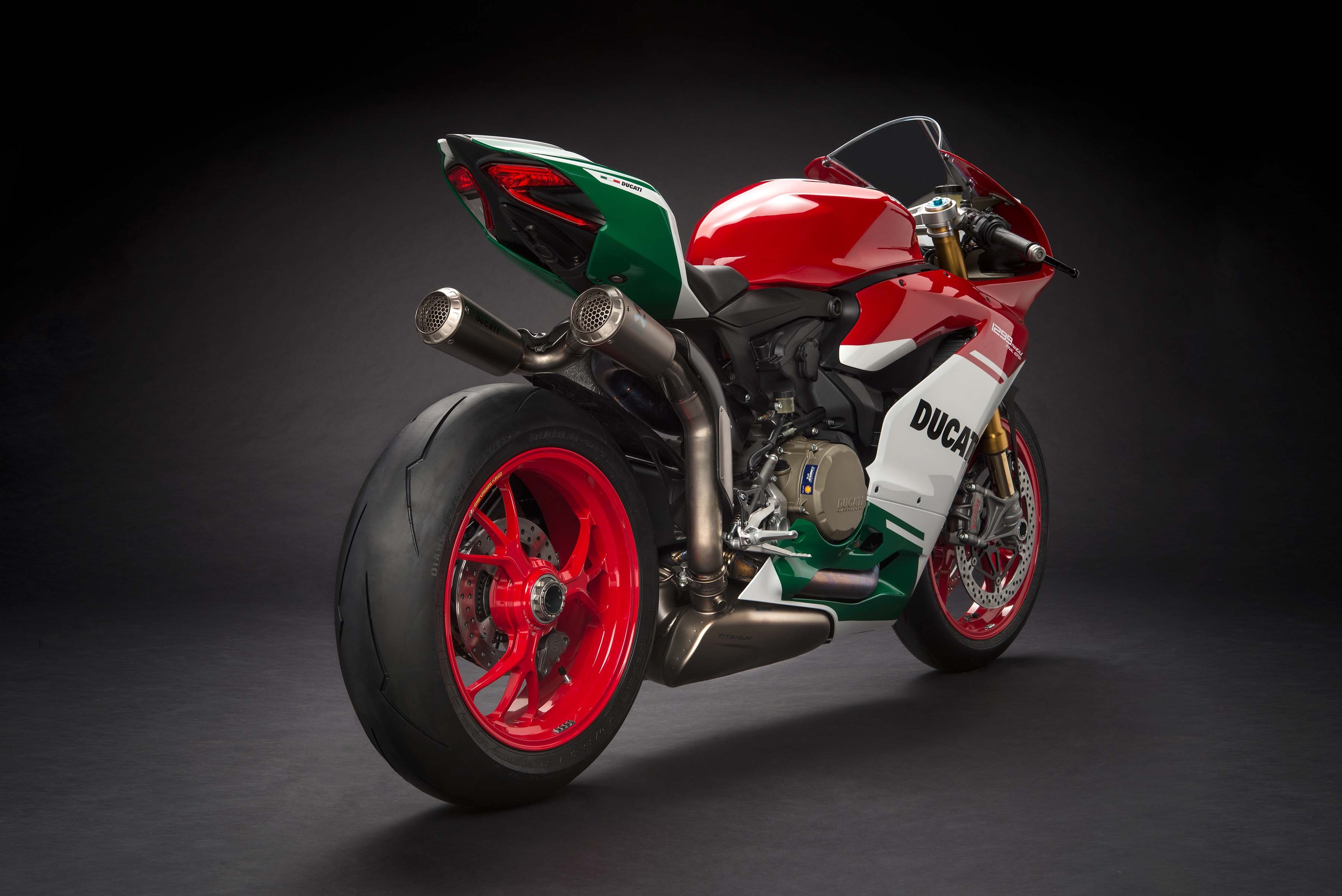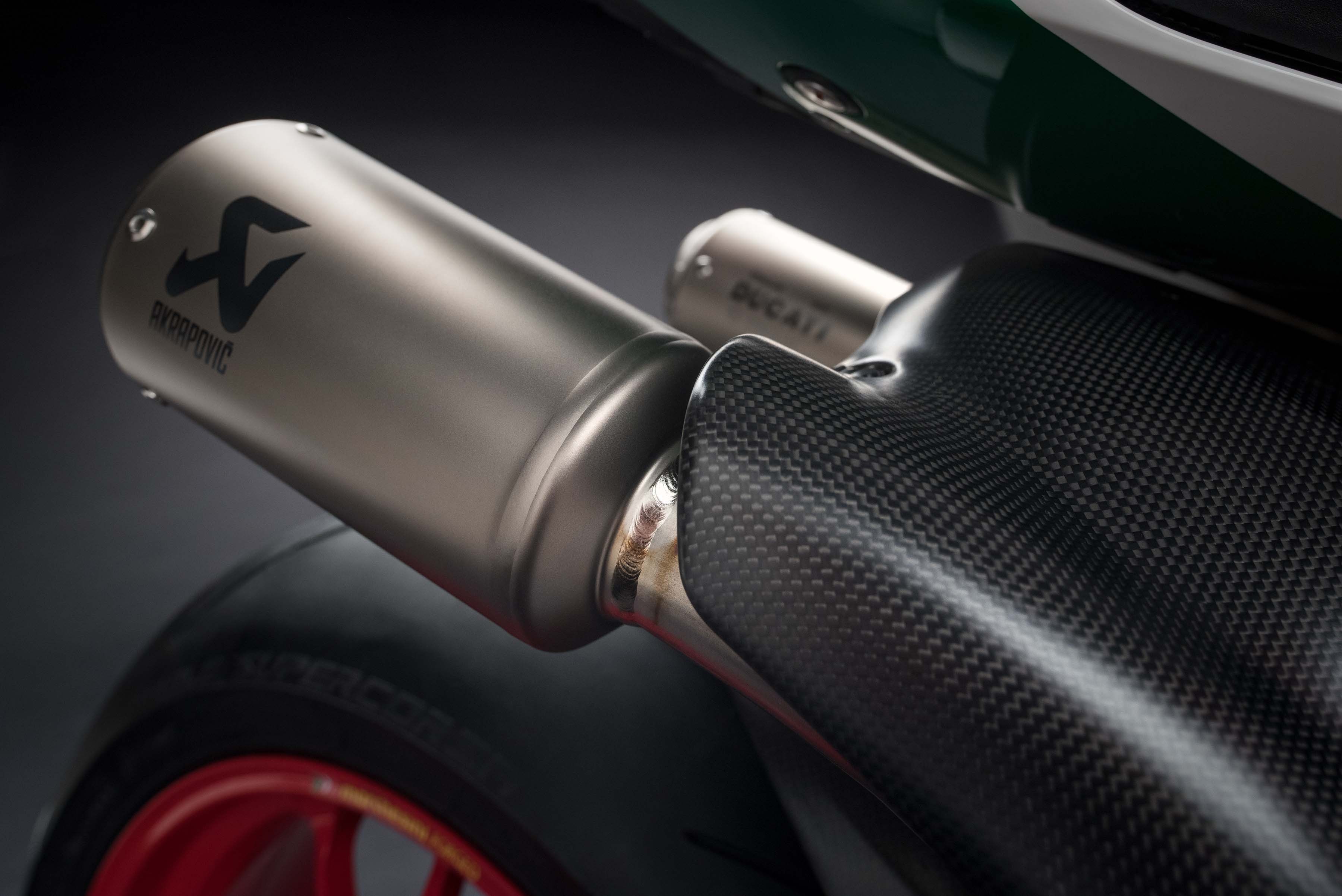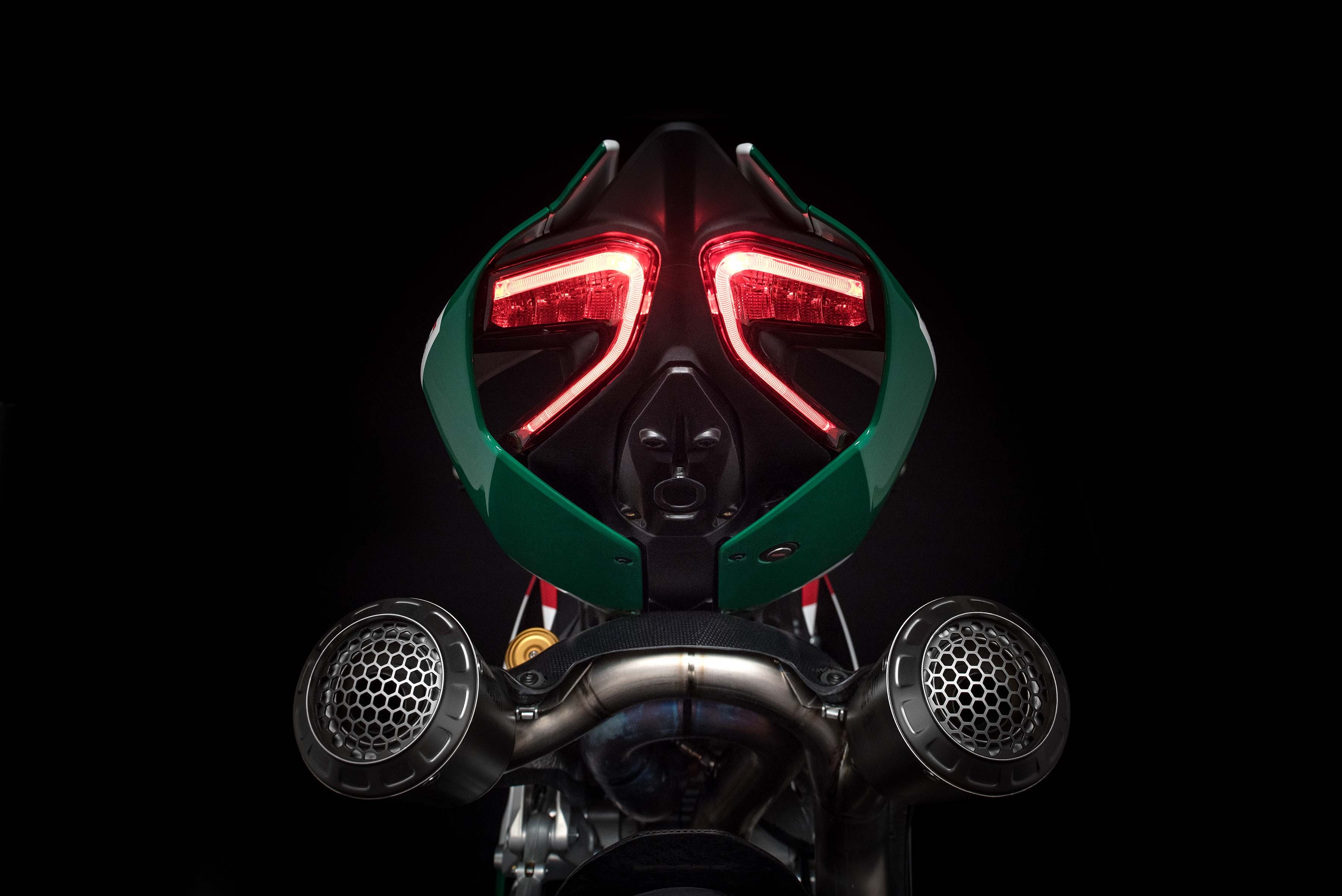 車身採用高階車款才有的Tricolore 義大利國旗配色,以及與WSBK 賽車設計相同的座下雙出鈦合金排氣管,由AKRAPOVIC 負責生產,造型非常漂亮,而且還符合歐盟四期法規,屆時應該可以原貌引進台灣。既然是高階車款,LED 燈具、前後OHLINS 避震、鍛造鋁框、BREMBO M50 一體成形輻射卡鉗當然只是最低要求,比較不同的是傳統鉛酸電池換成更輕、效能更好的鋰電池。