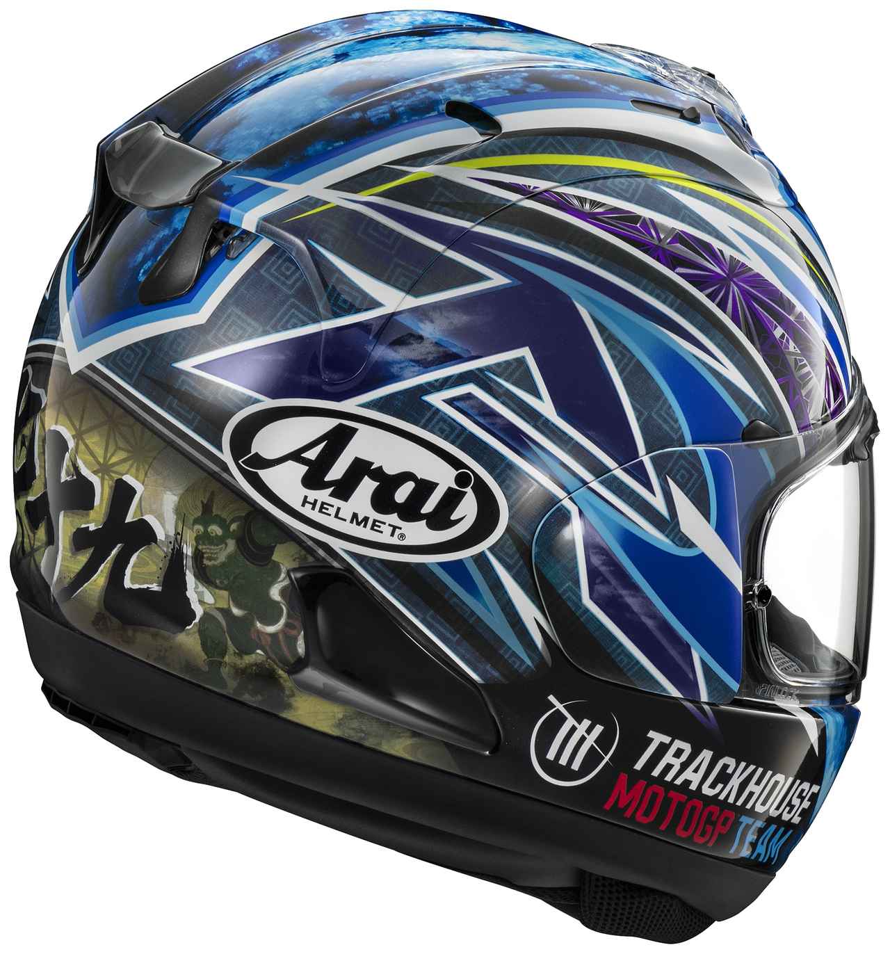 這款限定塗裝之所以迷人,很大一部分在於它對細節的極致追求,帽體主色調採用了與小椋藍姓名呼應的日本傳統「藍(Ai)」色,這種深邃的色澤與他在 Trackhouse MotoGP 車隊的賽車色彩相得益彰。