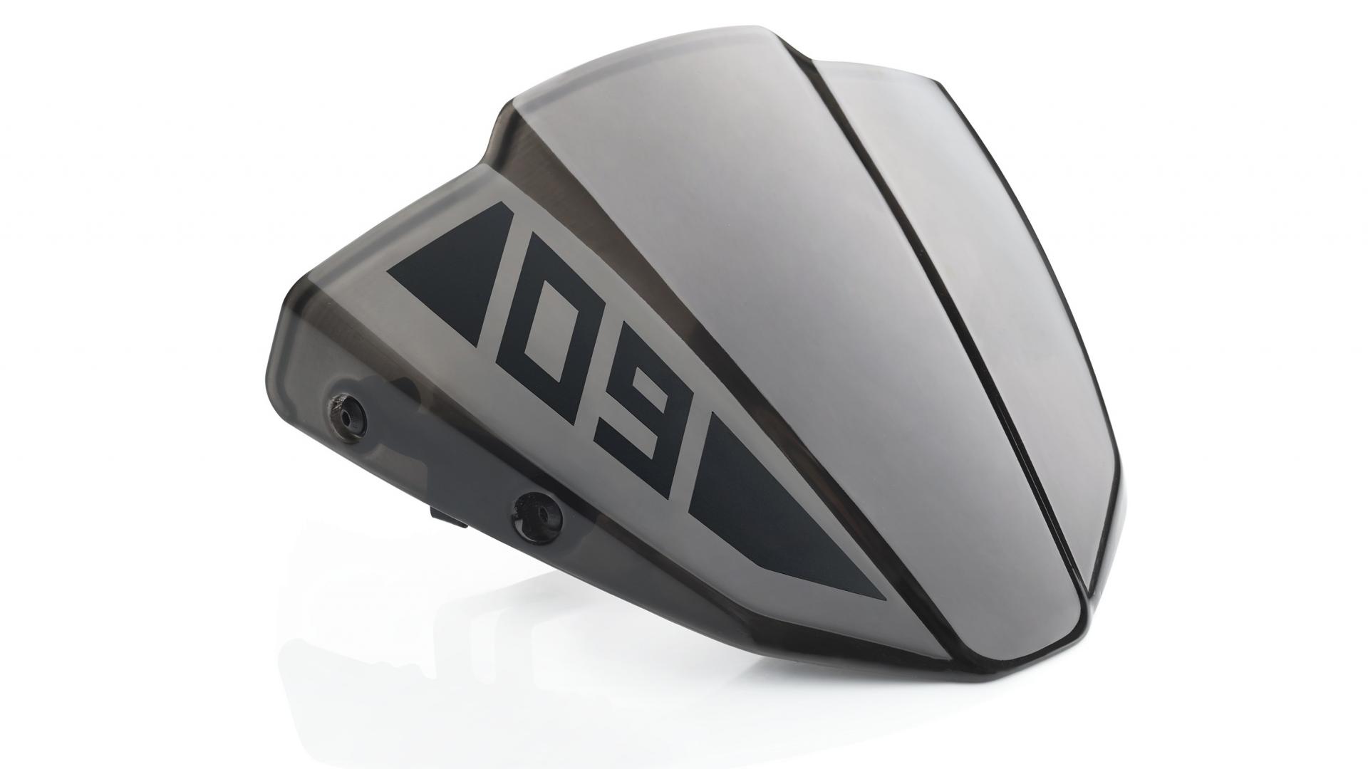 改款後的MT-09 將原來的單頭燈換掉,改為與MT-10相似的雙鷹眼燈具,不過燈具上方與儀錶之間似乎像少了甚麼東西,RIZOMA 在此設計了一款小頭罩,上面印有與原廠胸蓋相同的09 字樣,提升車輛整體感。可調後座腳踏共有三段位置選擇,如需常常載人或雙人長途旅遊,這會是一項貼心的投資。