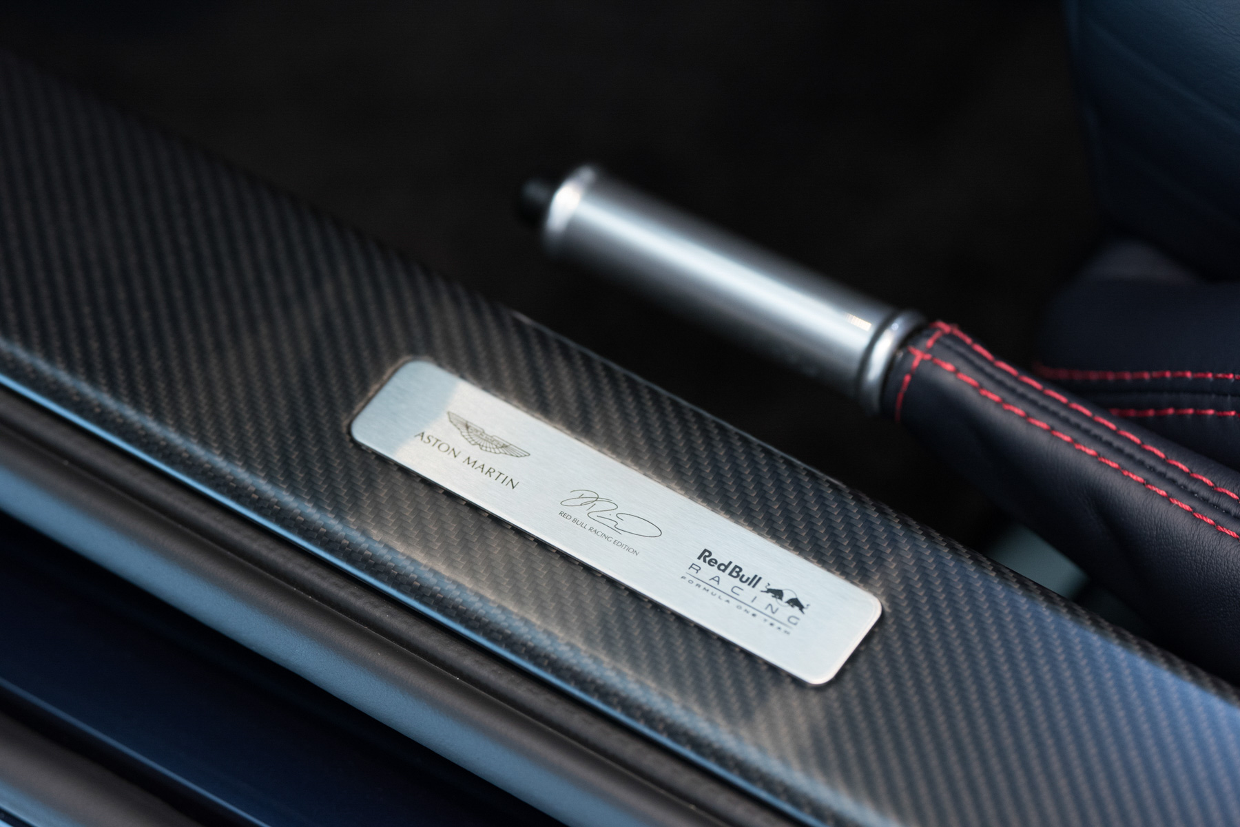 在外觀部分,深藍的車身漆色、搭配鮮紅色塗裝以及亮黃色的卡鉗,在在呼應Red Bull的專屬色彩語彙,而特別配置的碳纖維前後下擾流、水箱進氣孔、車側散熱孔飾條、後視鏡蓋…等,更凸顯出V8 Vantage S的運動跑格;在內裝呈現上,一貫的ASTON MARTIN細緻品味是必備要素,車室空間以沉穩時尚的藍黑色皮革為主軸,紅色及黃色縫線的搭配是個亮眼的設計巧思,大量選配的碳纖維更充斥於座艙中,例如碳纖維輕量化賽車桶椅搭配Red Bull Racing頭枕徽飾、碳纖維儀錶板及中控飾板、車門飾板、門把以及有Red Bull Racing車手Daniel Ricciardo 或 Max Verstappen專屬簽名的碳纖維門檻銘牌,都讓V8 Vantage S RBR Edtion更具收藏價值的紀念意義。