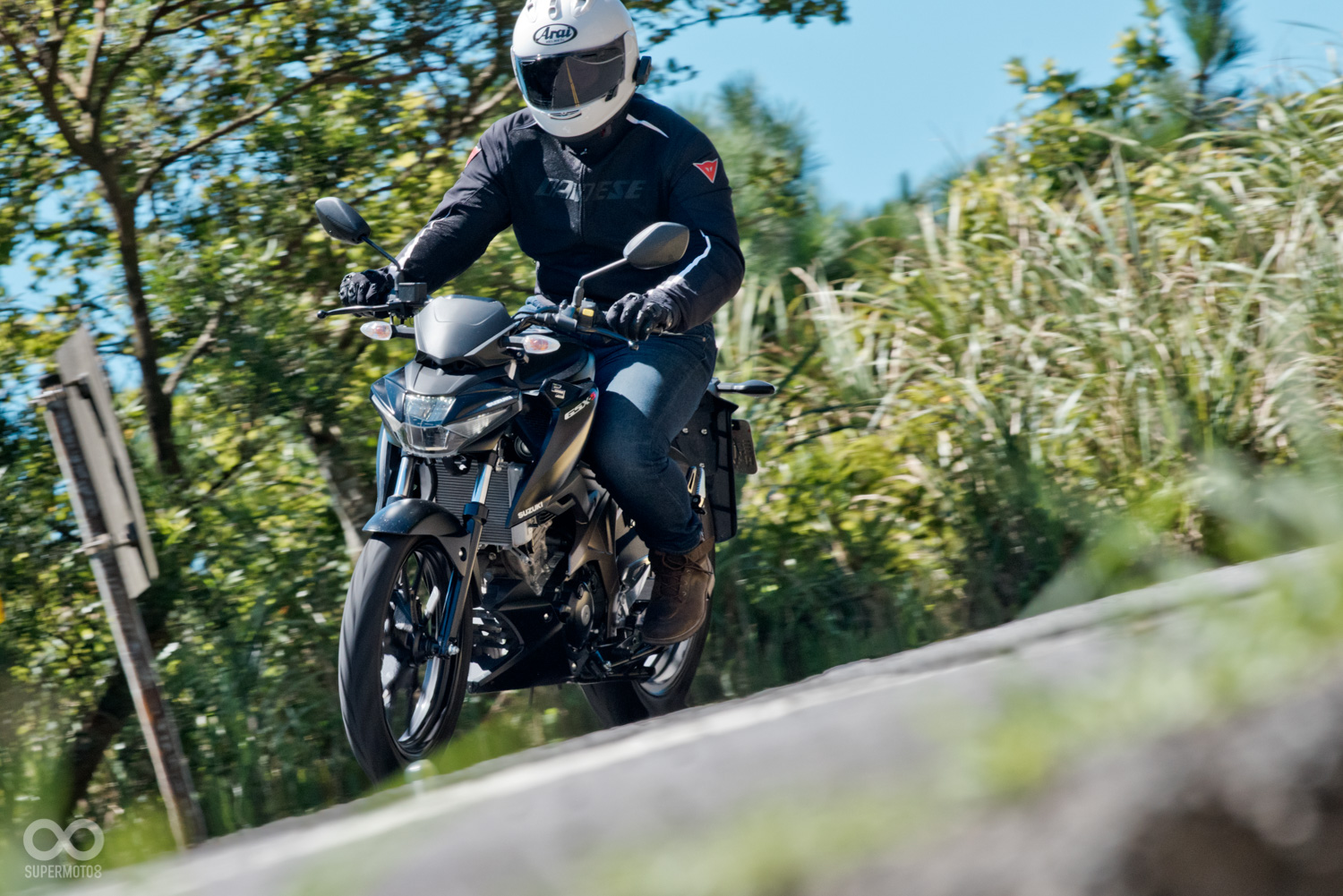 在市區騎乘時,GSX-S150狹窄的車身與靈活的身段,讓我在下班的車潮中如入無人之境,輕鬆愜意的悠遊於車陣之間,但進入了山道方才的輕靈就顯得有些不安定,加上車頭偏輕,在進彎重煞時的路感較為模糊,但好在後懸吊表現得相當出色,只要適當的調整步調,車輛便能輕鬆地在彎中找到平衡,雖不如大車那樣平穩,但GSX-S150的俐落與純粹的機械反饋所帶出原始的操控樂趣實在令人意猶未盡。