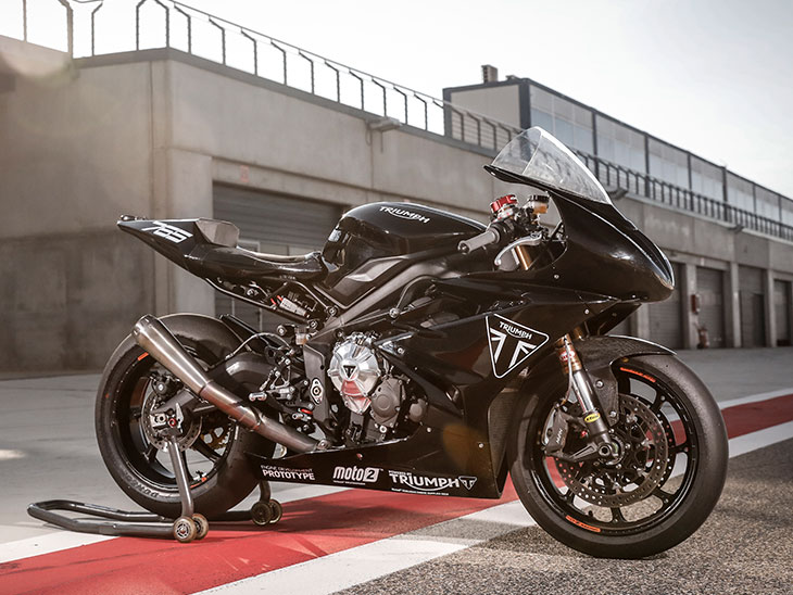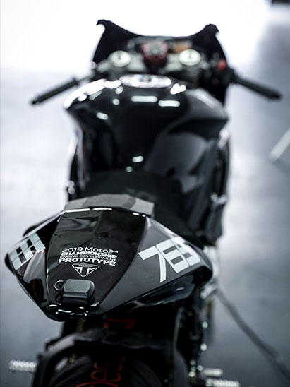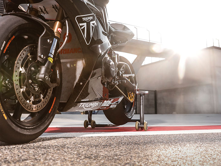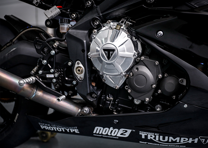 凱旋的這輛賽車有著原型車架,水冷直列三缸引擎是根據2018 Street Triple 修改而來,汽缸頭內的近排氣道做了優化,使混合氣流動得更順暢,汽門材質改成鈦合金,汽門彈簧硬度增加,讓這具引擎可以比市售版拉轉得更快、輸出更強。一檔變速比往下調降了一些,以適應比賽的特殊起跑方式。