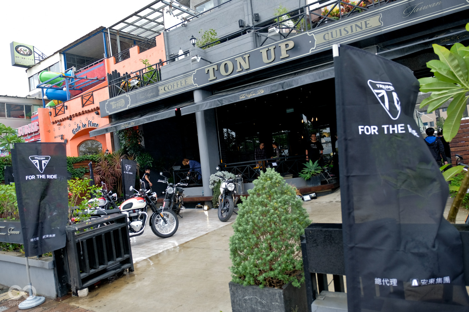 台灣總代理安東貿易今日晚間同時在八里區 Ton Up Cafe 舉辦 2017 TRIUMPH Cafe Day,全台 TRIUMPH 車主一同前來共襄盛舉,不但搶先鑑賞 TRIUMPH 的全新車款,更可一睹 TRIUMPH 各式經典車款風采,感受這百年品牌的迷人魅力,樂團帶來的精彩表演,相信讓現場氣氛感受到專屬 TRIUMPH 英倫經典氛圍的一夜。