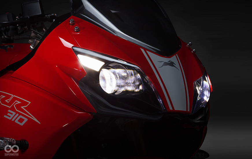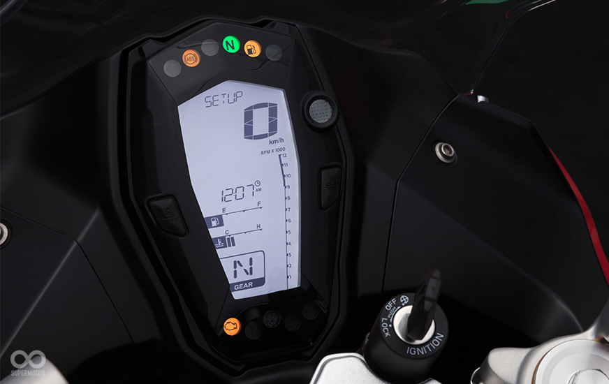 而與使用著息息相關的儀表板也一改TVS傳統的指針式設計,換上了全液晶的LCD儀表板,除了基本的功能之外還加入了便利的檔位顯示功能,燈具照明方面,RR310全車的燈具皆為LED,車頭的部分甚至還用射了魚眼透鏡,而尾燈的部分也加入了導光條,讓他在夜晚也有著極為優異的辨識度。