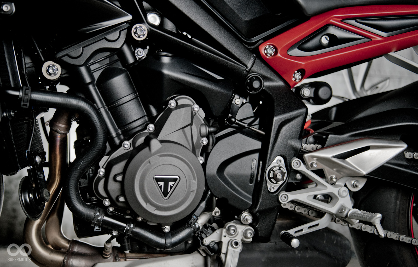 新一代的Street Triple搭載一具排氣量765cc直列三缸水冷發動機,看似與前代差異不大,但其實更動幅度高達90%,缸徑與衝程也完全不同,不但在動力方面提升了超過15%,重量更是直接少掉了1.2kg,搭配上全新設計的電控油門,動力輸出線性好掌握,紅線高達12,000rpm的激昂咆哮更是令人流連忘返。