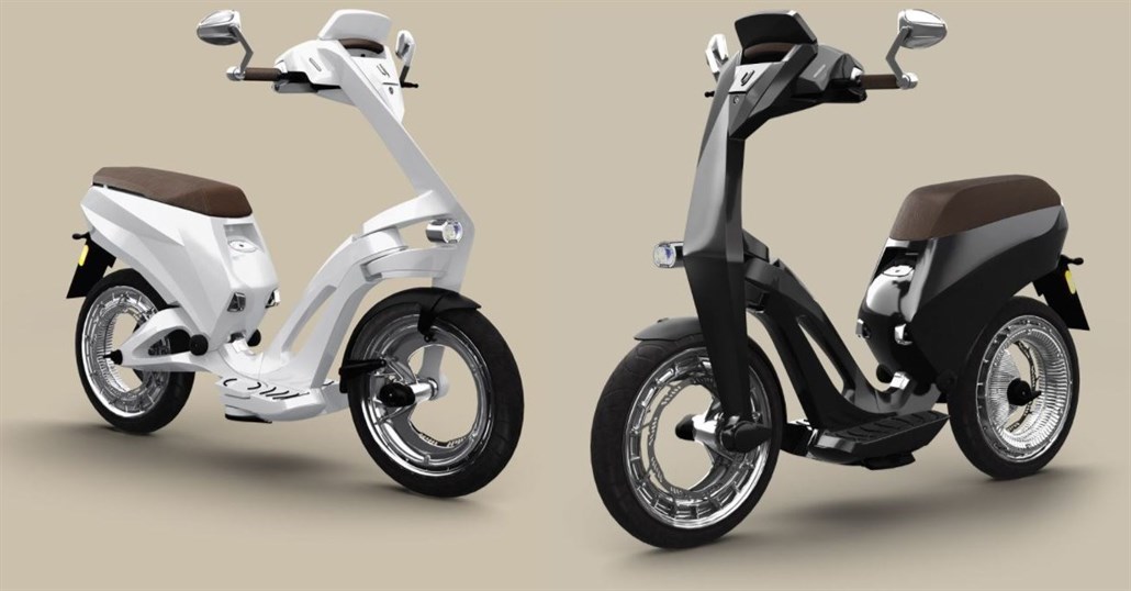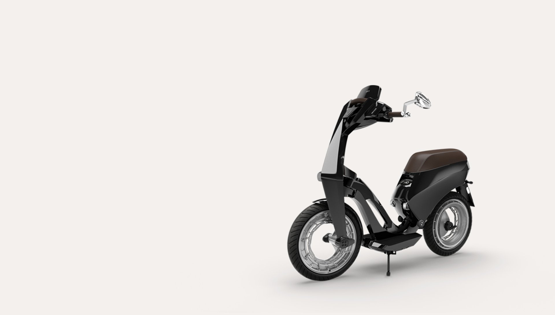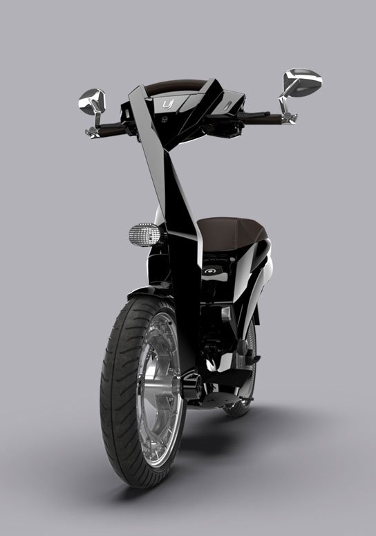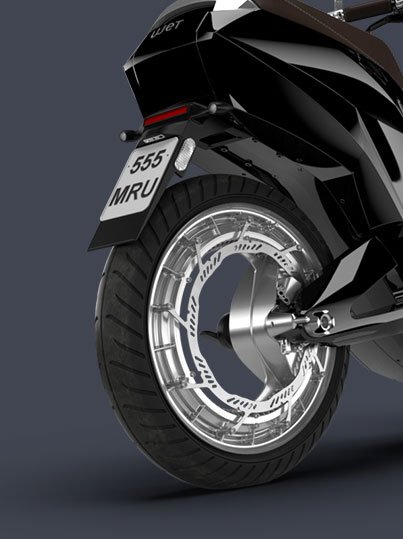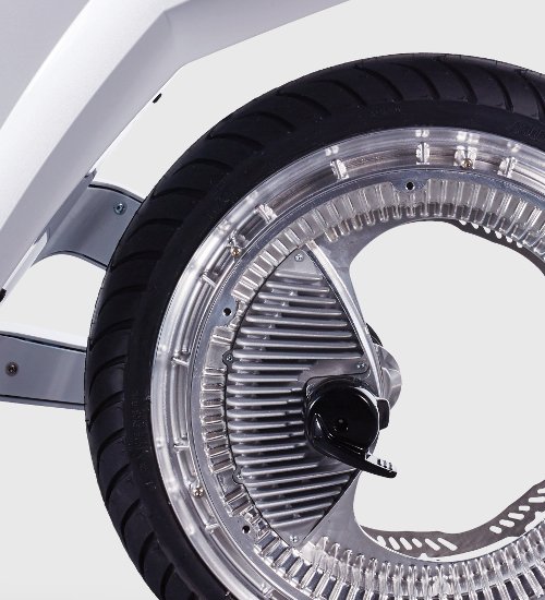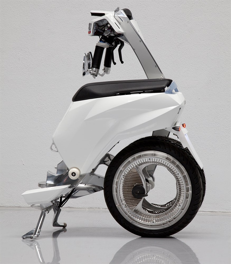 這台外型十分前衛的折疊速克達為前後14吋輪框,皆以單搖臂方式固定。動力來自一顆安裝在後輪編上的馬達,所以沒有輪轂,最大輸出有5.4 hp。前後輪的剎車碟盤為類BUELL 的圓周碟,卡鉗則同樣位在無輪轂的輪框邊。