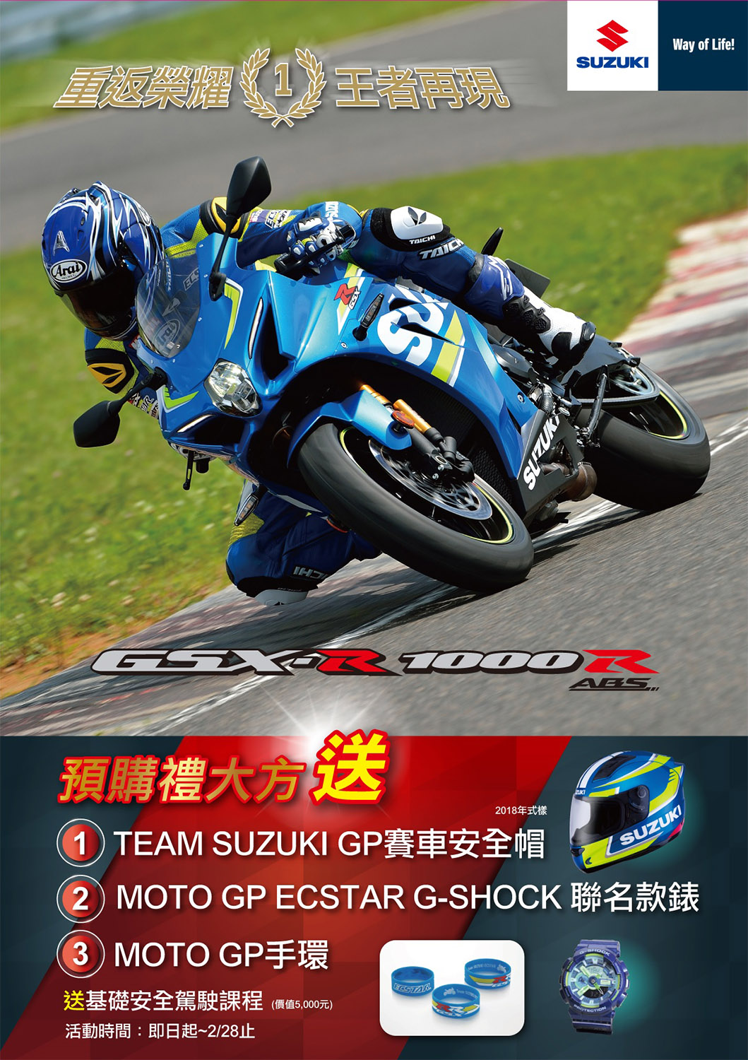 台鈴 SUZUKI 為感謝支持 GSX-R1000 的消費者, 針對 2018 年式 GSX-R1000R 正式展開預購活動,凡於 2/28 前預購 2018 年 GSX-R1000R 的準車主,可享有價值高達約 15,000 元的限量限定三好禮, 好禮絕無僅有,欲購從速,立即體驗駕馭 GSX-R1000R 的絕佳操駕快感。