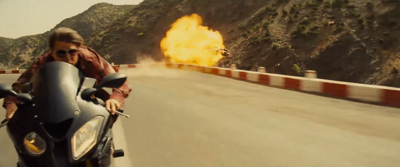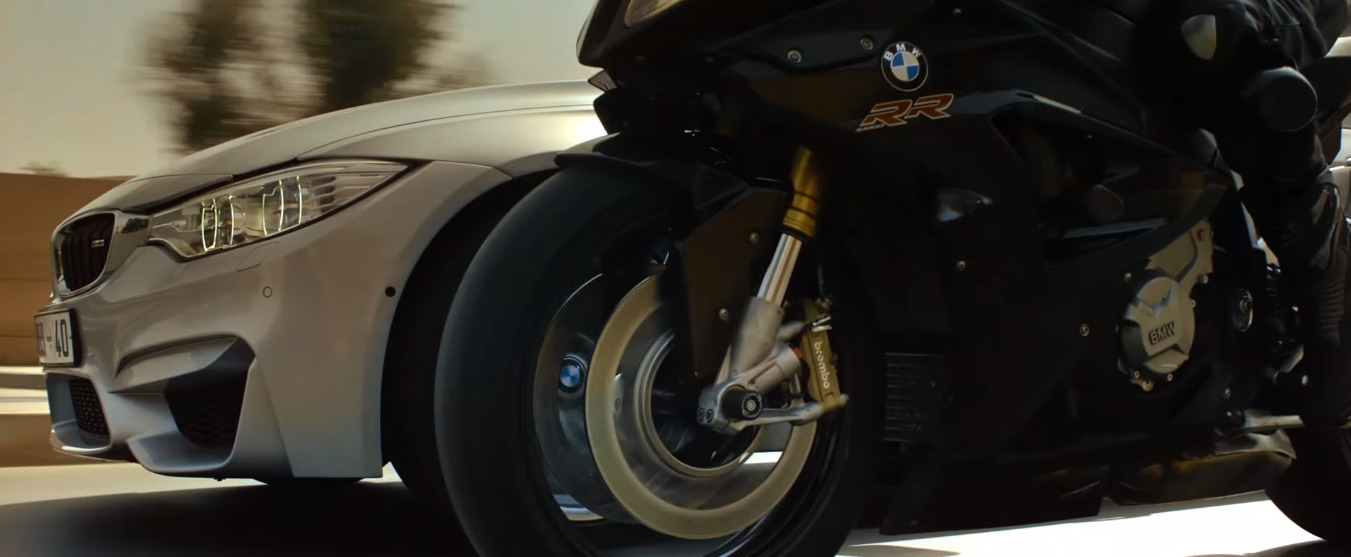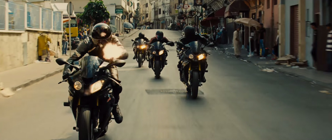 伊森韓特(湯姆·克魯斯)與 班吉(IMF電子專家)開著銀色M3再巷弄中追逐女主角伊爾莎,搶奪他手上的機密磁碟。同時又被許多騎著黑色S1000RR的殺手追逐,甩尾、滑胎、爆破樣樣來。在M3撞毀後伊森韓特換騎S1000RR在山路與殺手們上演極限側掛過彎展現高超技巧。那第一人稱的山路臨場感受,讓人感覺置身現場。