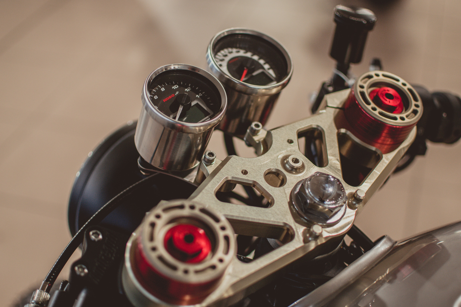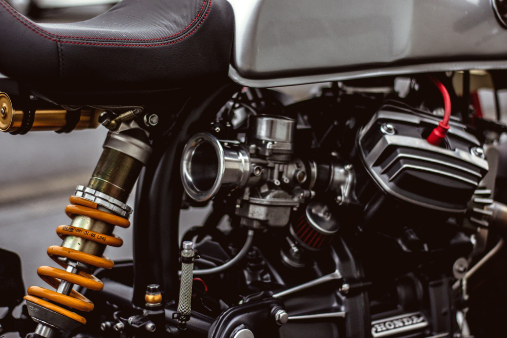 為完整保留那粗曠的性感,他將引擎外觀烤上深邃的霧黑再配上那Y字排氣管前段,完全展現老V缸的美!追求一個極簡造型他去除掉不必要的零件與車殼,讓車身輕量化同時線條變得俐落,簡單的鋼管後搖臂配上Ölhins中置避震,引擎到後輪線條一氣呵成。為了展現咖啡風格前叉用上強壯的紅色倒叉,三角台角度設定的更挺直,讓CX500的重心向前傾倒,最後裝上分離斜把、單座皮椅、拋光的大油箱與單片後土除。一個重獲新生濃郁咖啡味的HONDA CX500出現在你眼前。