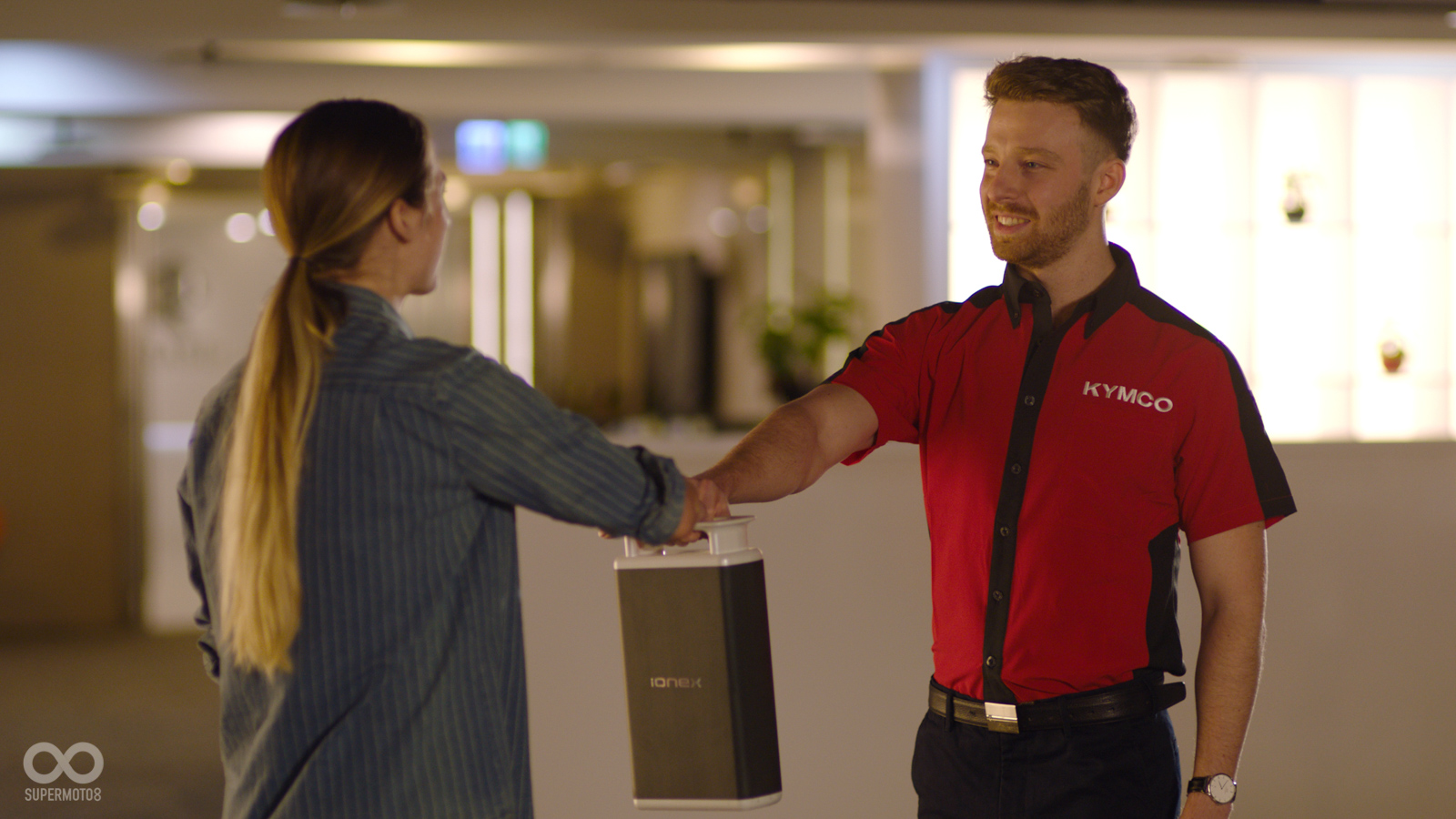 相較Gogoro單顆9KG的電池重量,這次KYMCO IONEX成功將電池縮小至5KG,也因此輕鬆充、換電的概念得以實踐,即使是女性使用者也能優雅操作,而巧妙的方形把手設置,讓力氣大的男性也可利用單手一次提起兩顆電池,符合了不同使用者需求。