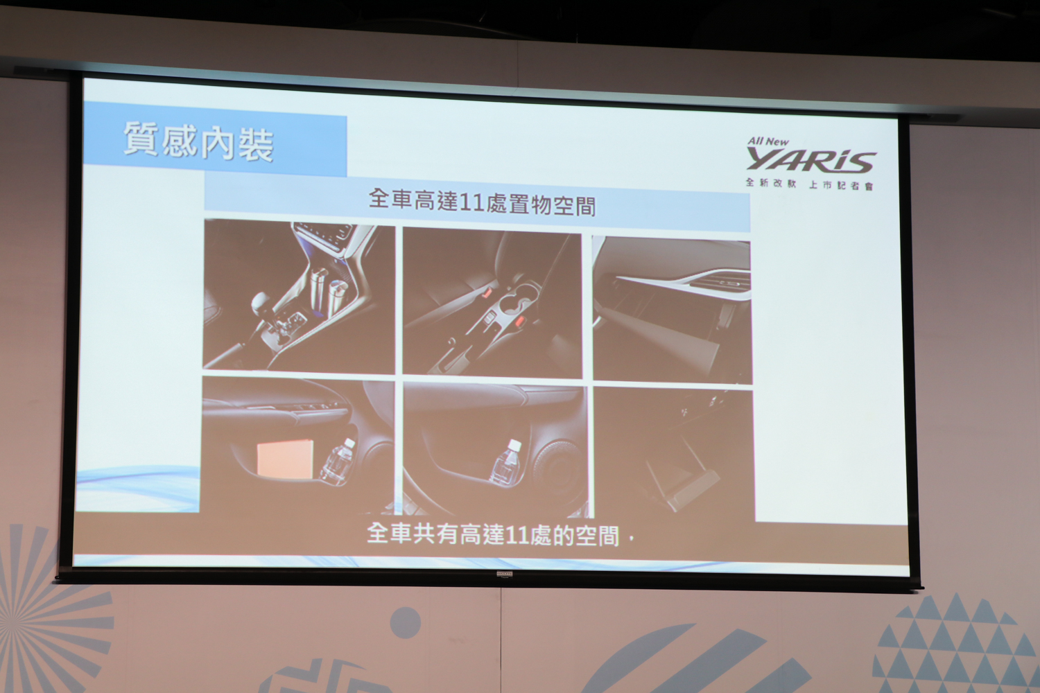 改款後的Yaris內裝設計質感大幅提升,整體以大量鋼琴烤漆與霧銀材質搭配,並導入自發光三環式儀表板(經典以上),車室內扶手及座椅則採用皮質縫線點綴,打造前所未有的精緻質感。此次改款車室內提供高達11處置物空間,除了有前座雙置杯架附LED照明燈,後座亦可運用中央置杯架放置飲料、水瓶。而後座平整化地板、6/4分離座椅,提供舒適、靈活配置的車室空間。