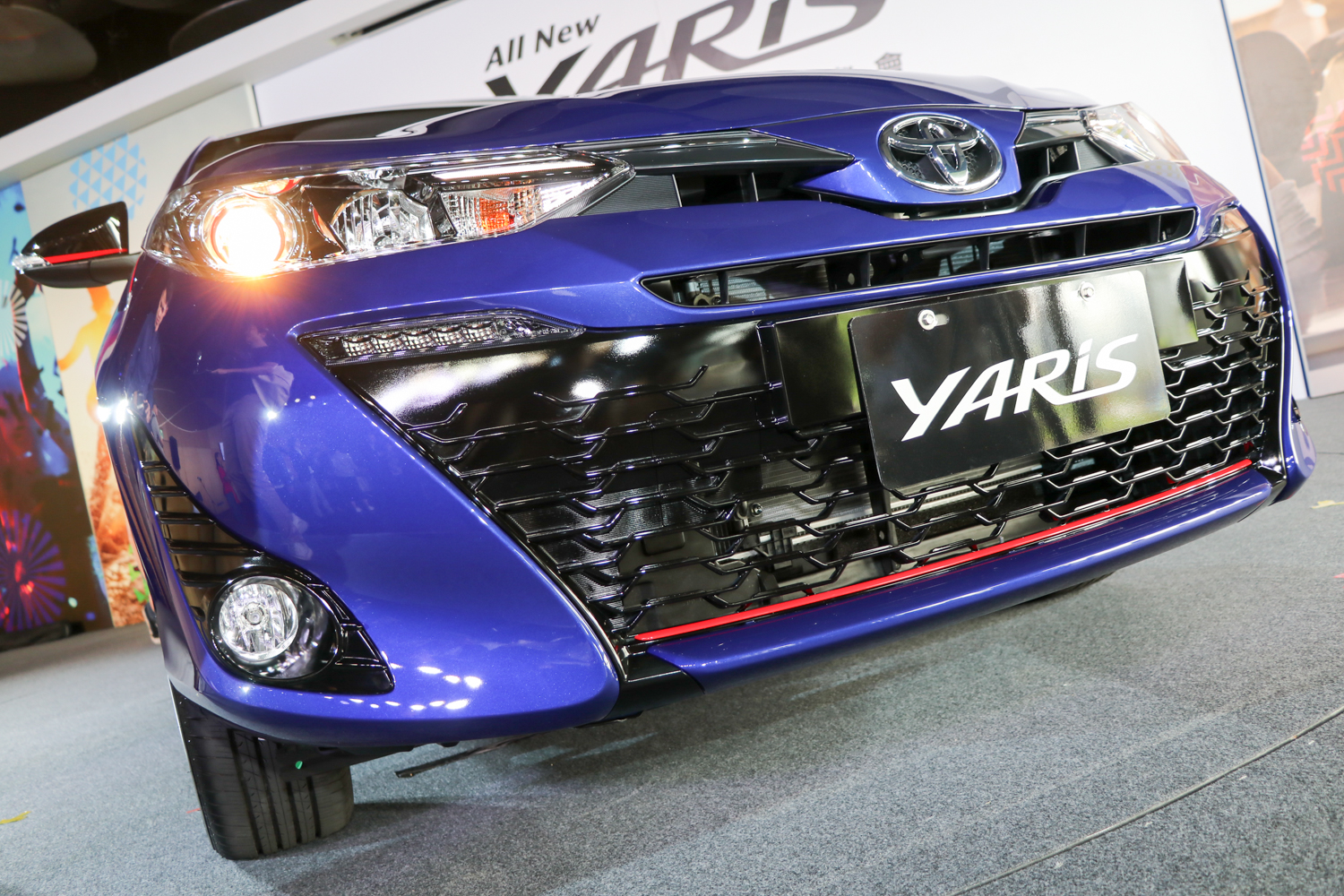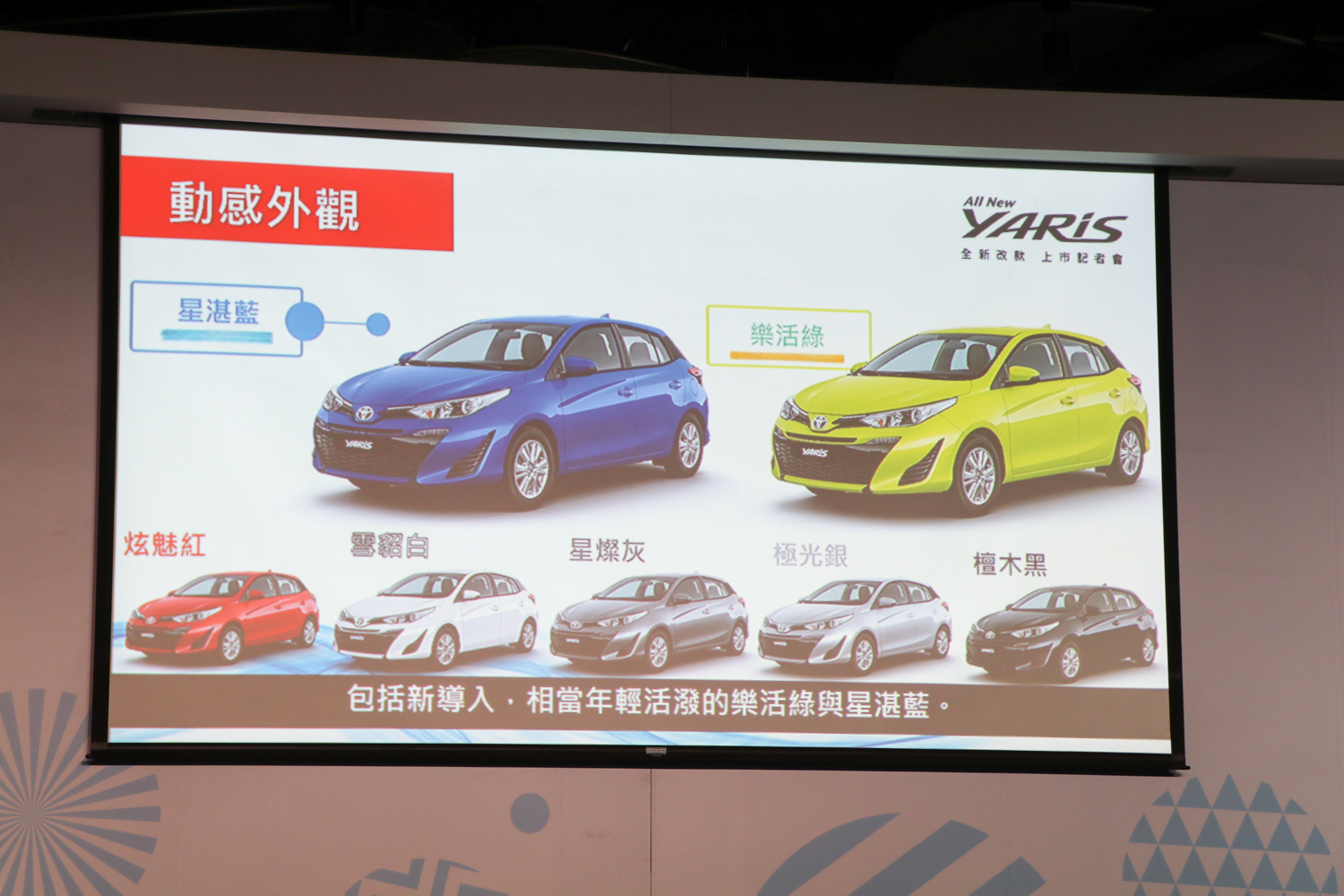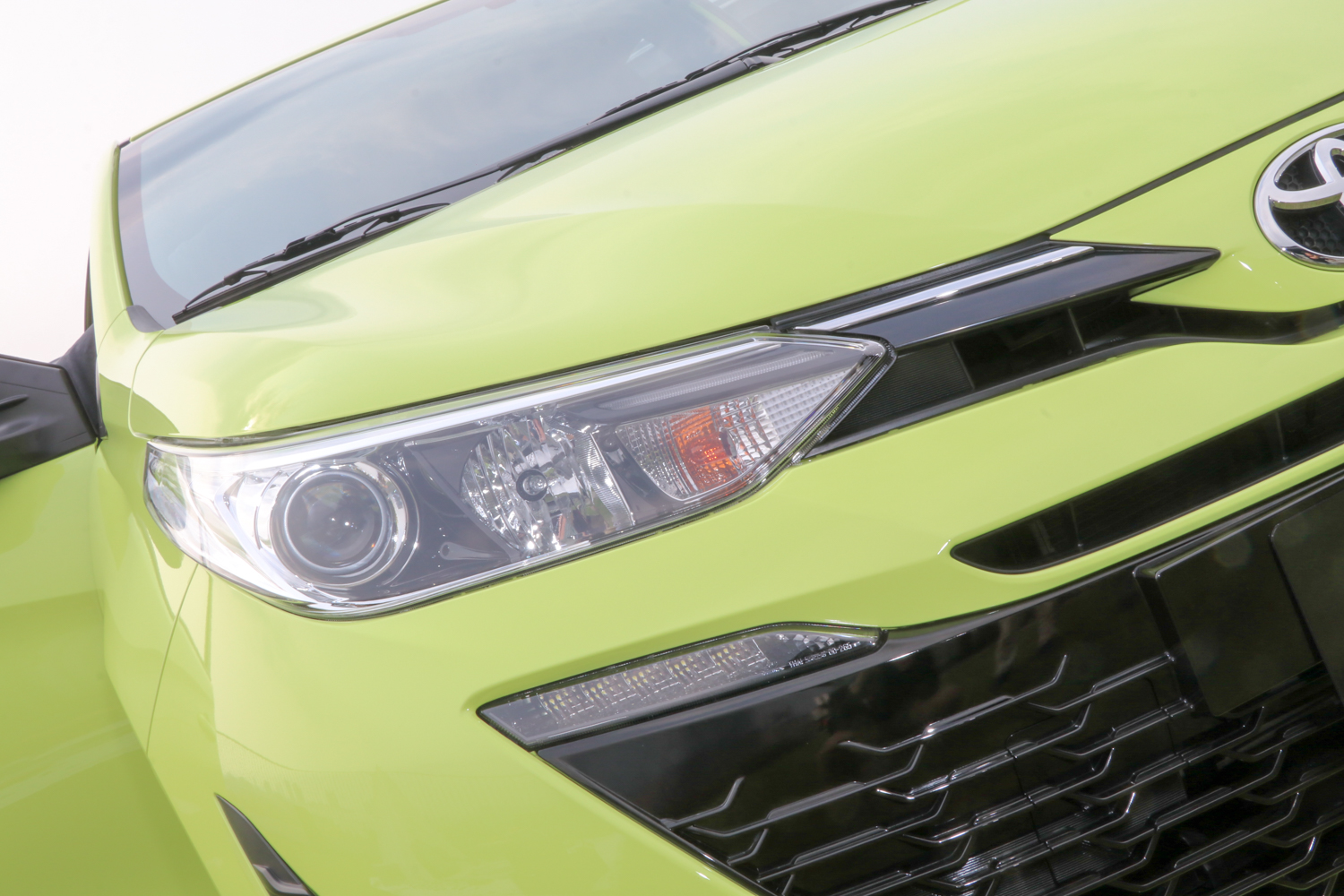 外觀設計上保留了Toyota家族風貌Keen Look設計語彙,藉由網柵式倒梯形大型進氣壩打造動感的前視造型。車身線條一路延伸至車尾,整體造型更加俐落動感;而全車標配鯊魚鰭式天線,強化運動化氛圍,讓車輛外觀造型帥氣度大提升。車尾採用黑色鋼琴烤漆牌照框飾條,拓展後擋風玻璃邊界,視覺感受更加寬闊。搭配LED光條式尾燈(豪華以上),打造整體高級質感。此外,Yaris也導入全新外鈑色:星湛藍及樂活綠,提供7種顏色做選擇。
