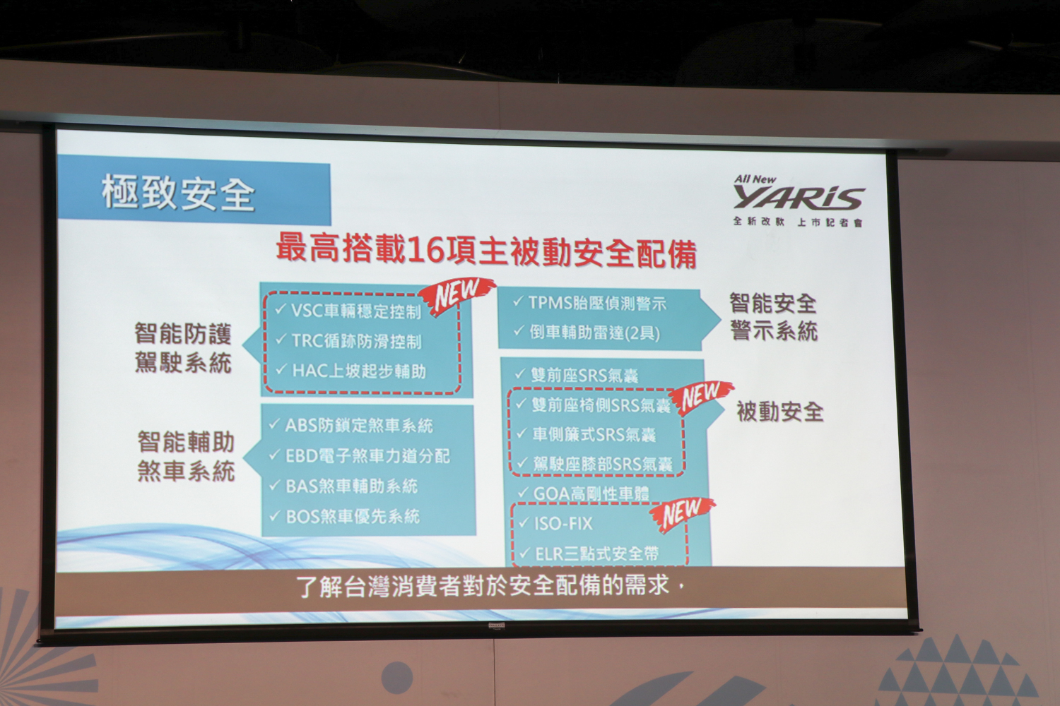 和泰汽車為了滿足年輕族群追求時尚、引領潮流,本次Yaris全新改款,外觀造型更加動感流線;於內裝方面,整體質感大幅提升,設計更是讓人耳目一新。而響應國內安全意識抬頭,Yaris全級距升級搭載VSC/TRC/HAC、LED日行燈及頭尾燈自動啟閉系統,同時還搭載最高7SRS氣囊,讓台灣的消費者享有最好的安全配備,在小車的領域當中也可以成為安全的代表,只要買到65.5萬豪華型車款,就可以擁有最高規格的安全享受。