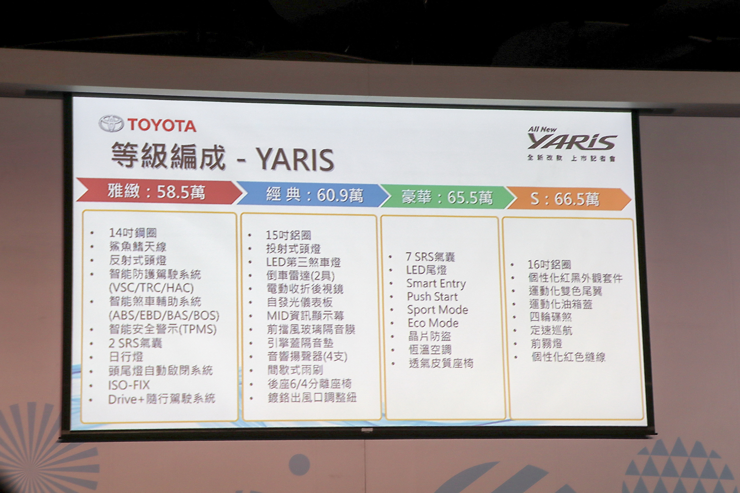 即日起販售的Yaris共四個等級:雅緻、經典、豪華、S版。建議零售價如下: