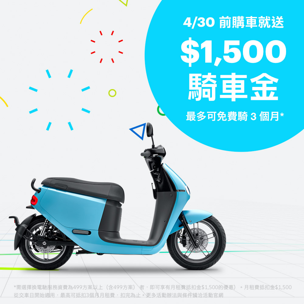 為了慶祝總里程數達到兩億公里,即日起購買 Smartscooter ® 智慧雙輪,消費者可獲得市價高達 1,500 元的「換電馳服務資費」抵扣金,最多可達 3 個月免付電池服務資費!同時,甫於上個月底剛發表的GoCharger ® Mobile 隨車電池充電器,才短短的上市幾日,就獲得眾多消費者詢問,限時優惠價購買活動持續開跑中,優惠將持續到4/30為止。詳細資訊請洽詢Gogoro各服務據點,或至活動網頁