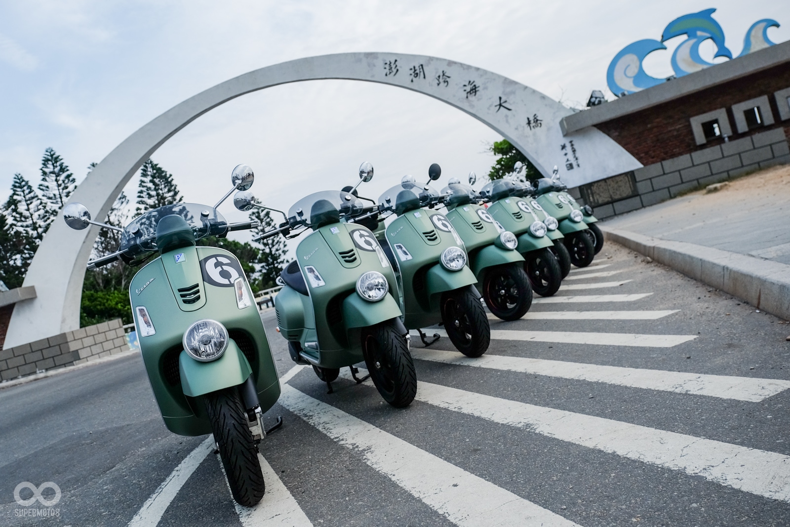 本次的兩天一夜的試車活動在澎湖的澎澄旅店展開,在飯店聽完車輛簡報與分組資訊後即可看見飯店外一字排開的Vespa GTV 300 Sei Giorni,本次除了全原廠的版本之外,總代理也準備了幾輛經過改裝的車輛供媒體拍攝,但是受限於陰晴不定的天候讓我們在旅遊景點便無多加停留,直接前往跨海大橋集合點。