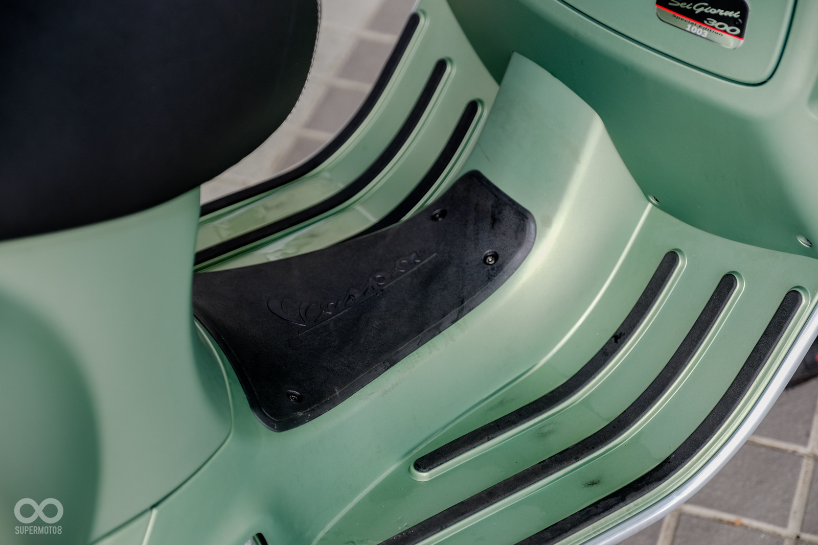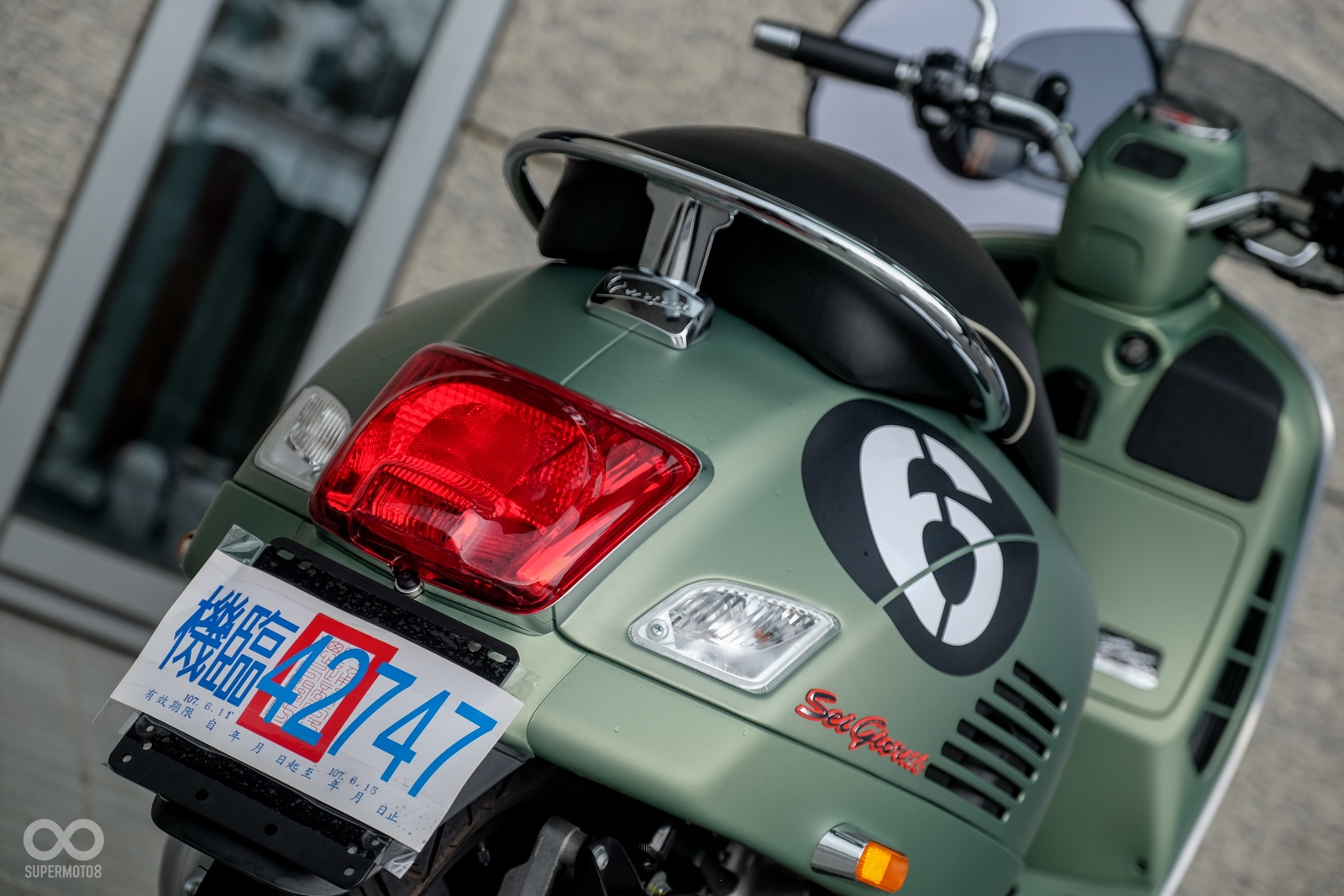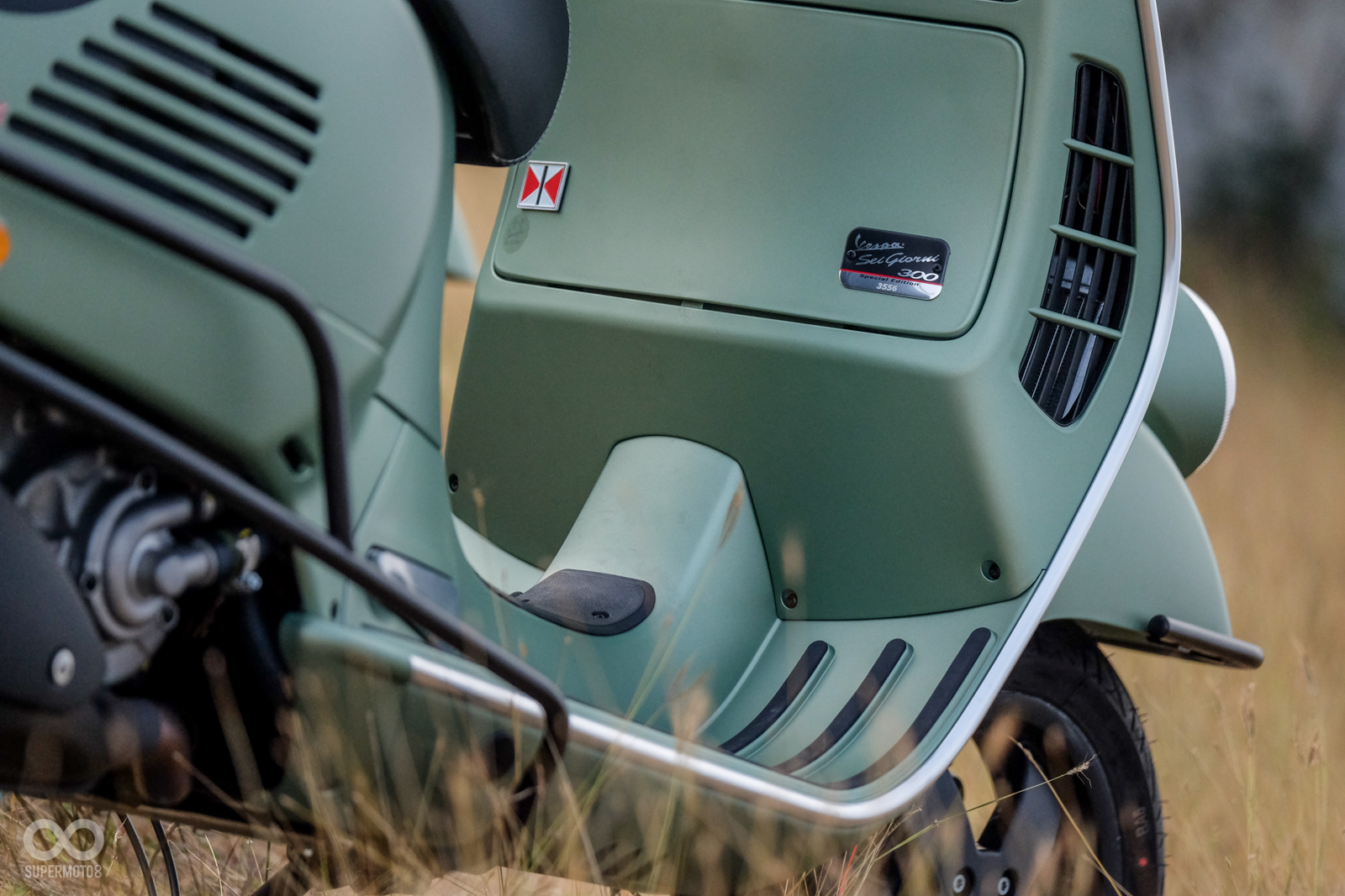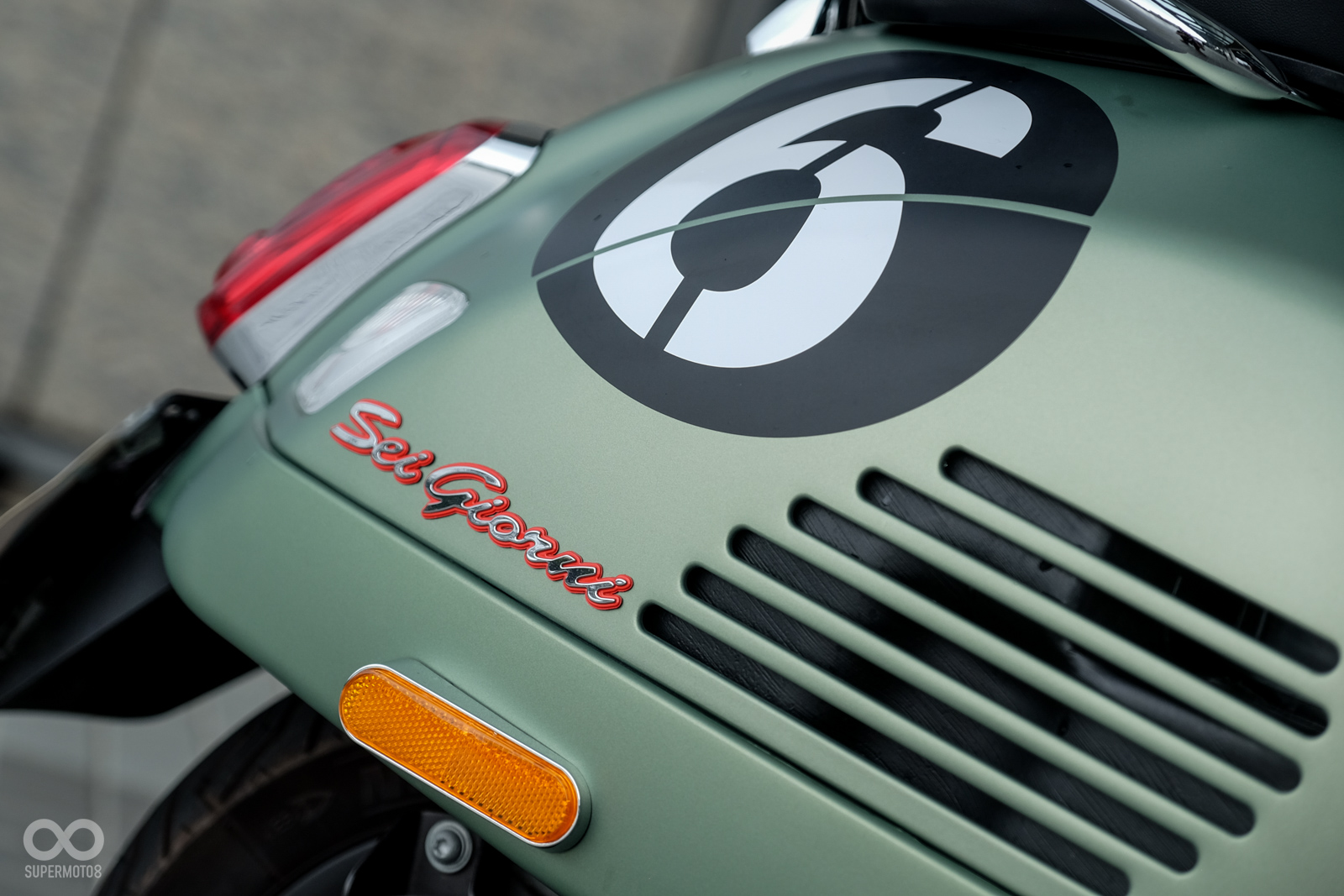 Vespa GTV 300 Sei Giorni以專屬的消光軍綠塗裝呈現,維持Vespa一貫的金屬車身,光是遠遠欣賞就可以感受到車輛的細膩質感,車頭上斗大的6號烤漆號碼牌更是突顯Sei Giorni的重要特徵之一,搭配上同樣是本車款標配的燻黑小風鏡,在車輛的經典外型中增添了幾分帥勁跑格。