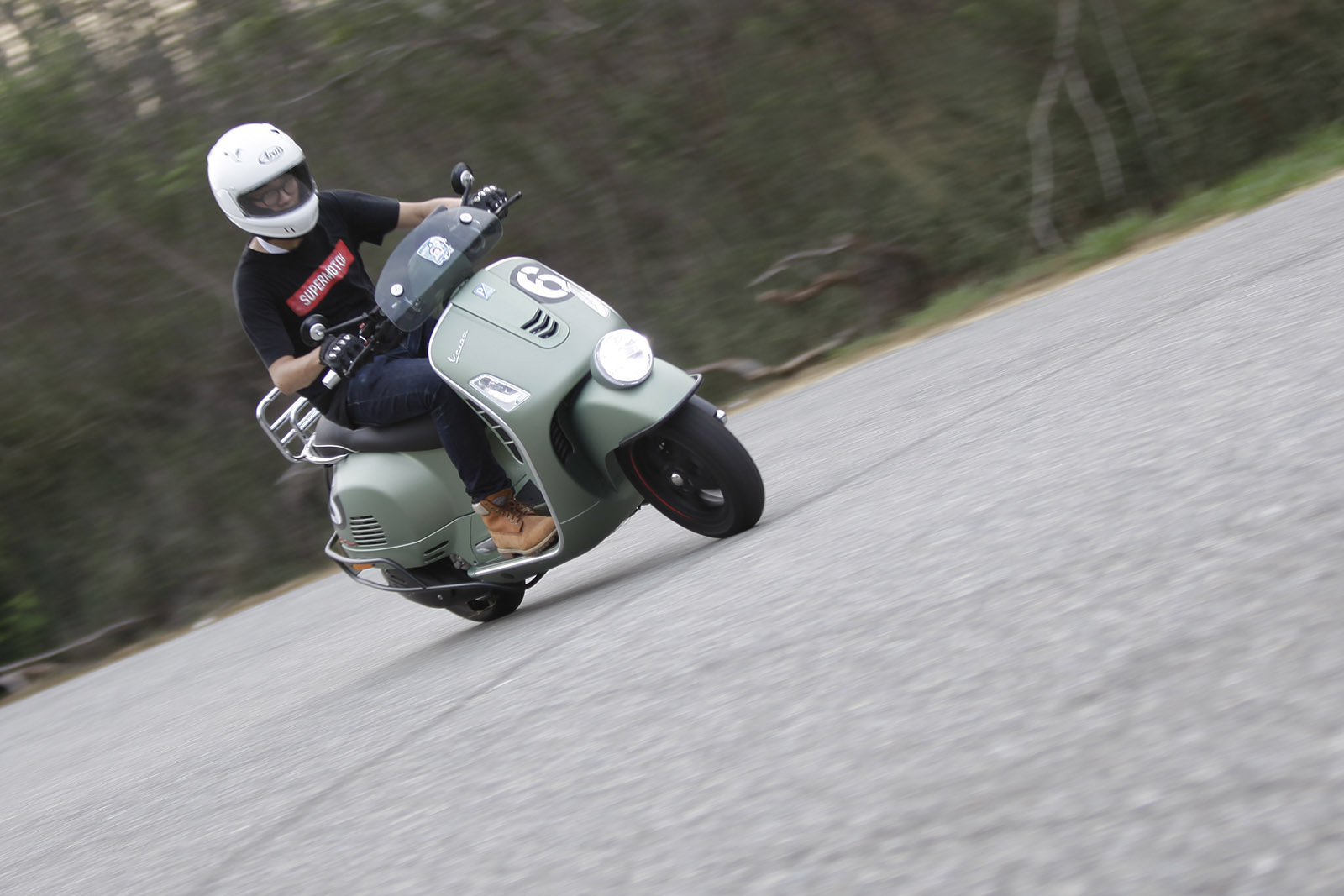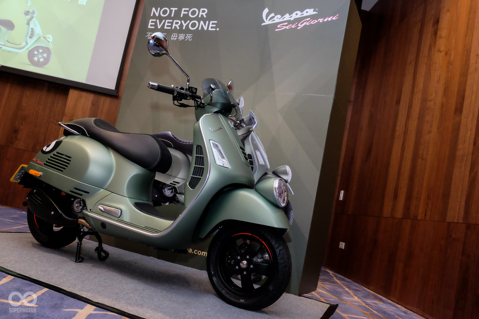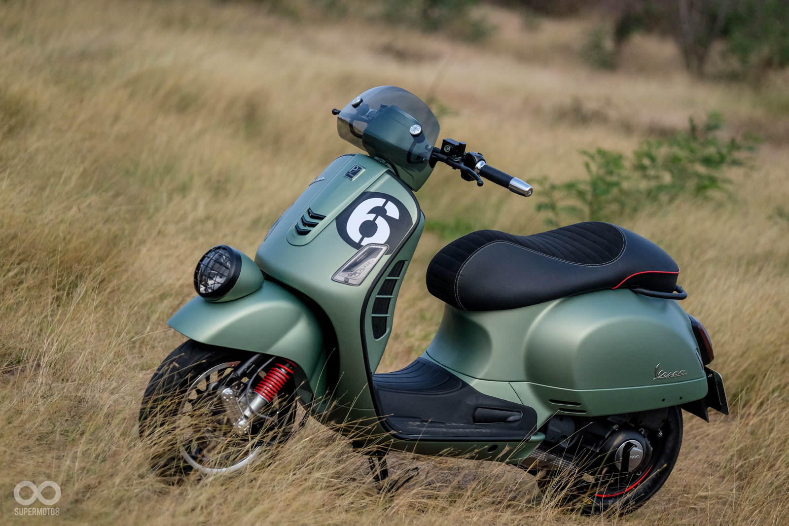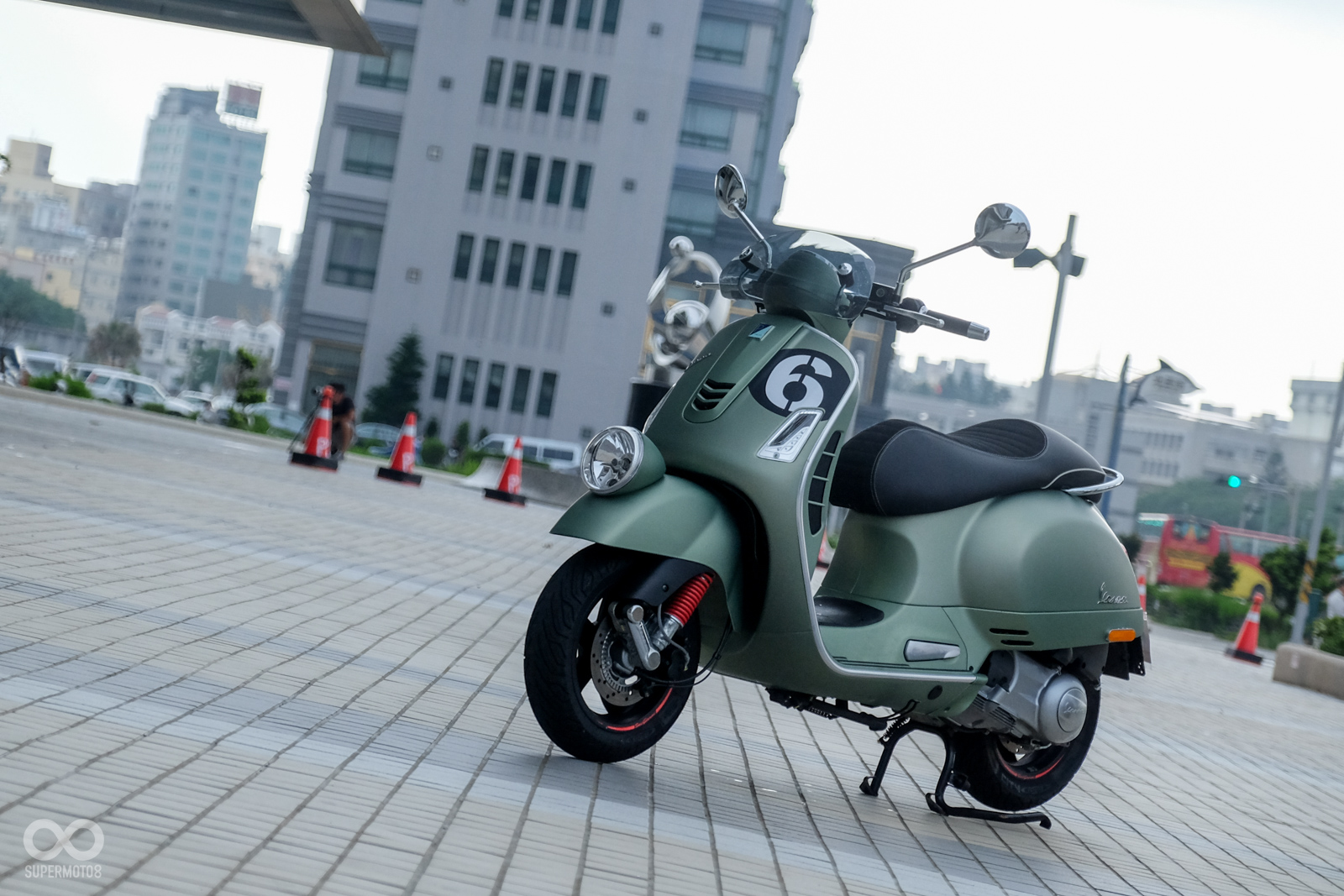 Vespa GTV 300 Sei Giorni以專屬的消光軍綠塗裝呈現,維持Vespa一貫的金屬車身,光是遠遠欣賞就可以感受到車輛的細膩質感,車頭上斗大的6號烤漆號碼牌更是突顯Sei Giorni的重要特徵之一,搭配上同樣是本車款標配的燻黑小風鏡,在車輛的經典外型中增添了幾分帥勁跑格。