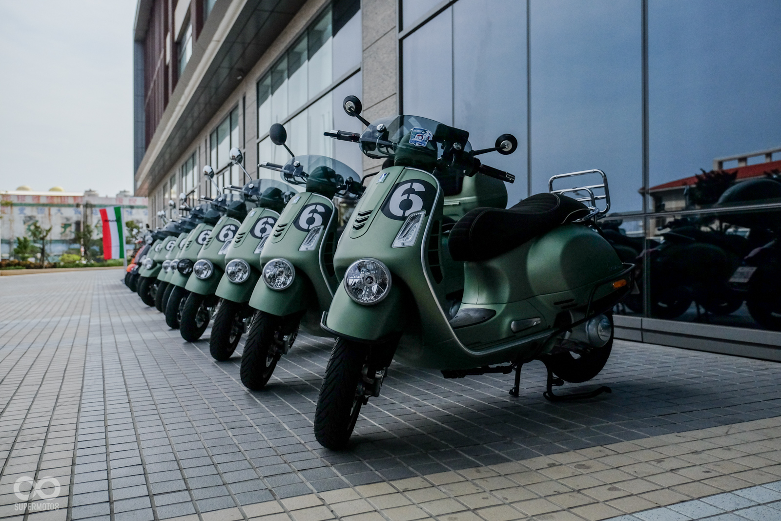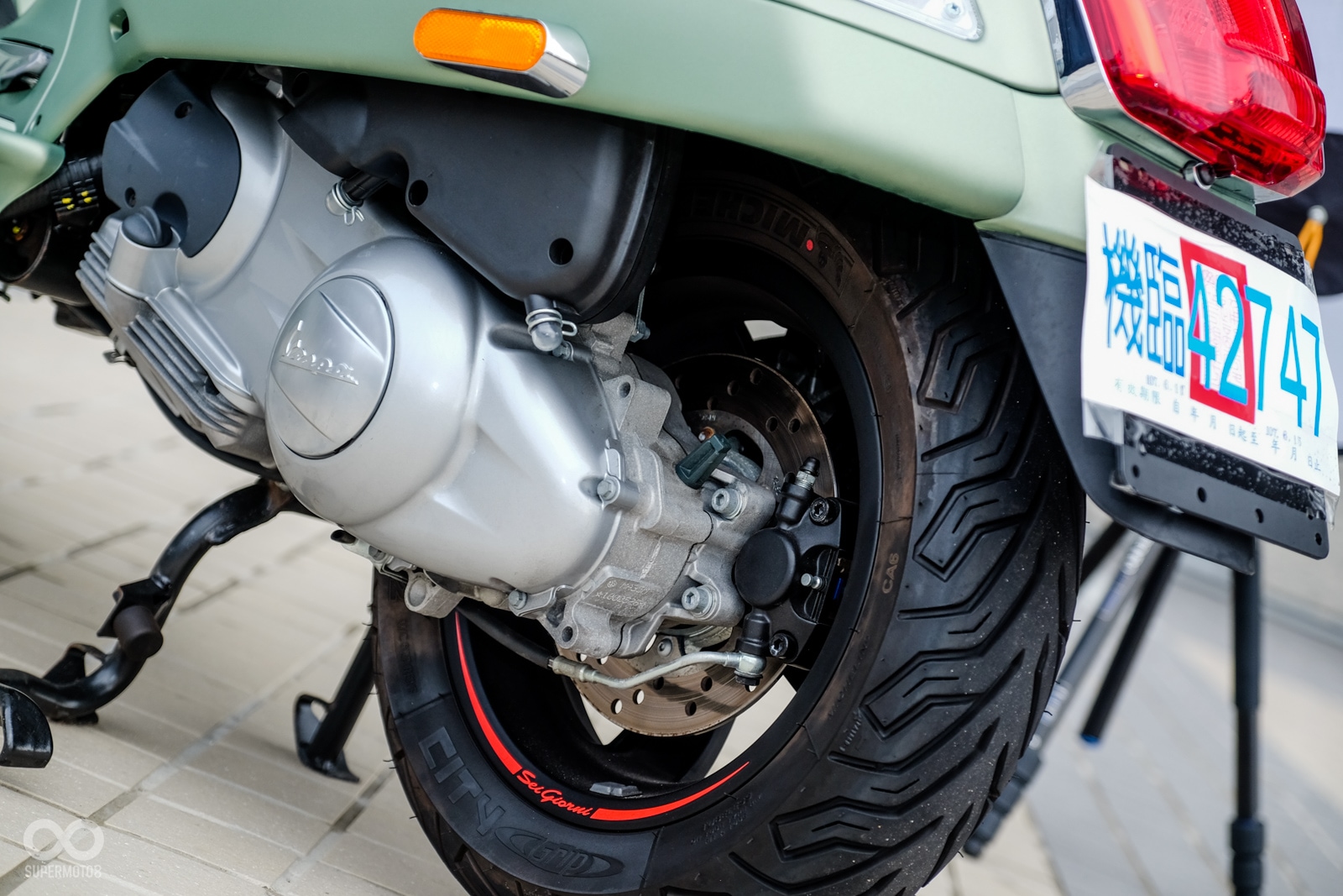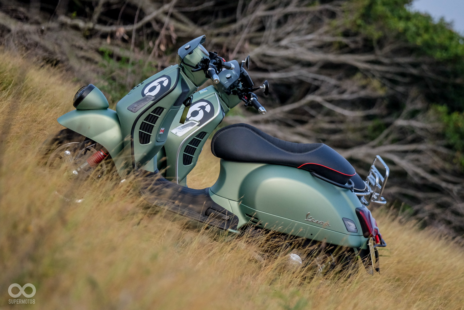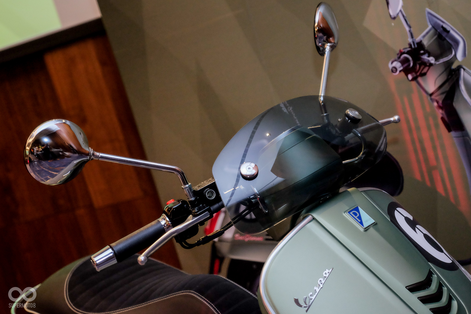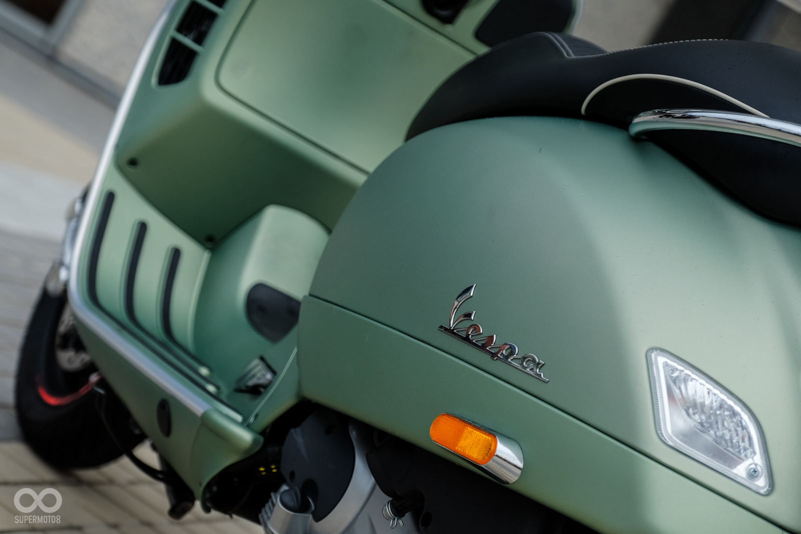 Vespa GTV 300 Sei Giorni以專屬的消光軍綠塗裝呈現,維持Vespa一貫的金屬車身,光是遠遠欣賞就可以感受到車輛的細膩質感,車頭上斗大的6號烤漆號碼牌更是突顯Sei Giorni的重要特徵之一,搭配上同樣是本車款標配的燻黑小風鏡,在車輛的經典外型中增添了幾分帥勁跑格。