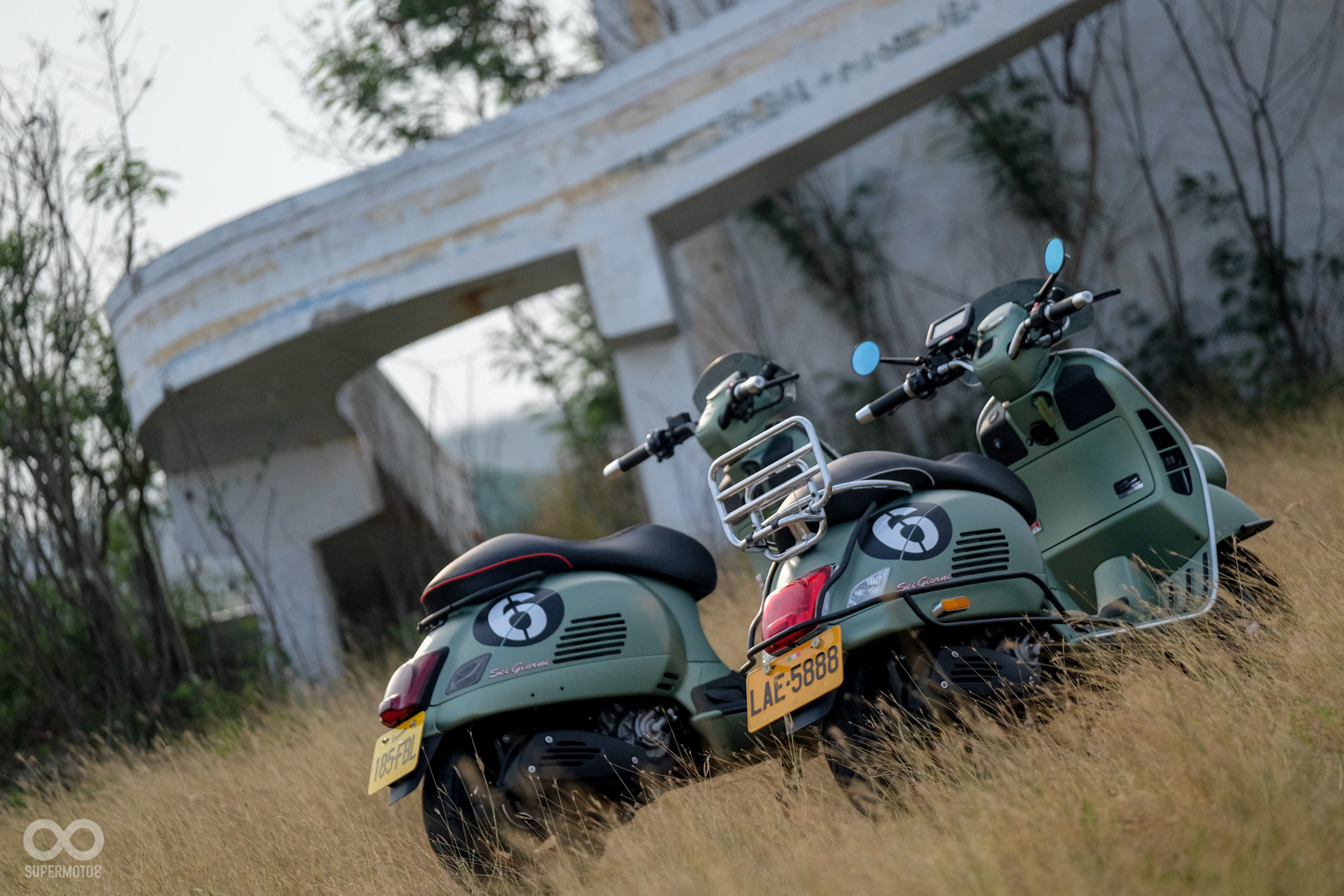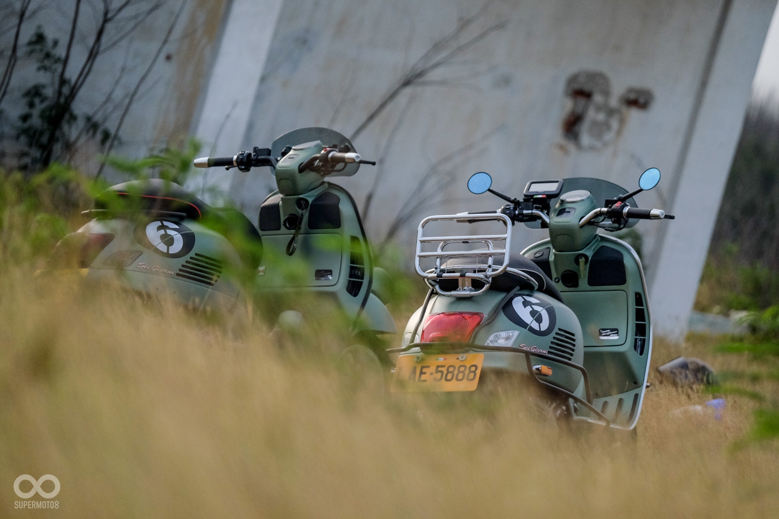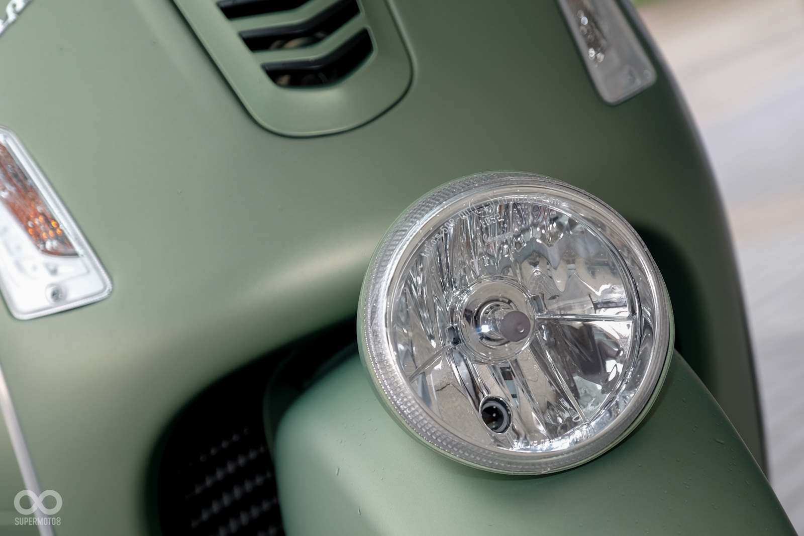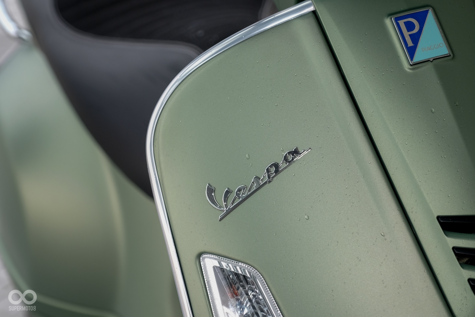 Vespa GTV 300 Sei Giorni以專屬的消光軍綠塗裝呈現,維持Vespa一貫的金屬車身,光是遠遠欣賞就可以感受到車輛的細膩質感,車頭上斗大的6號烤漆號碼牌更是突顯Sei Giorni的重要特徵之一,搭配上同樣是本車款標配的燻黑小風鏡,在車輛的經典外型中增添了幾分帥勁跑格。