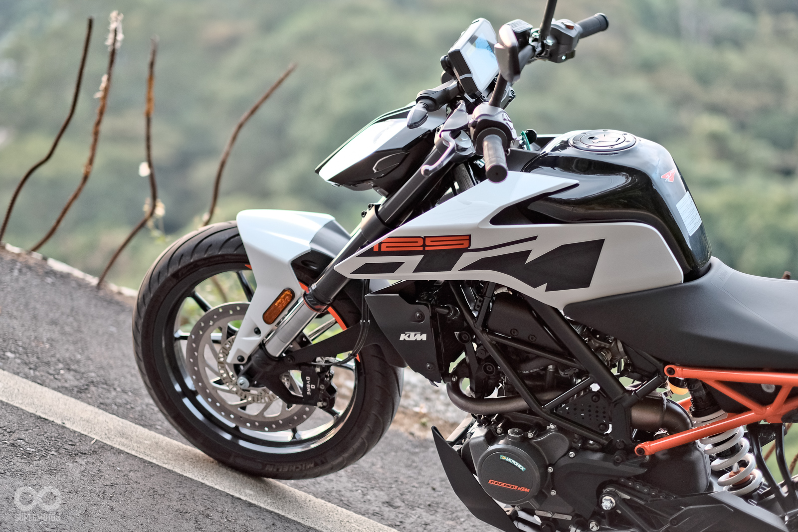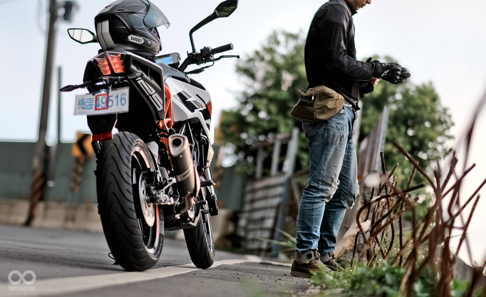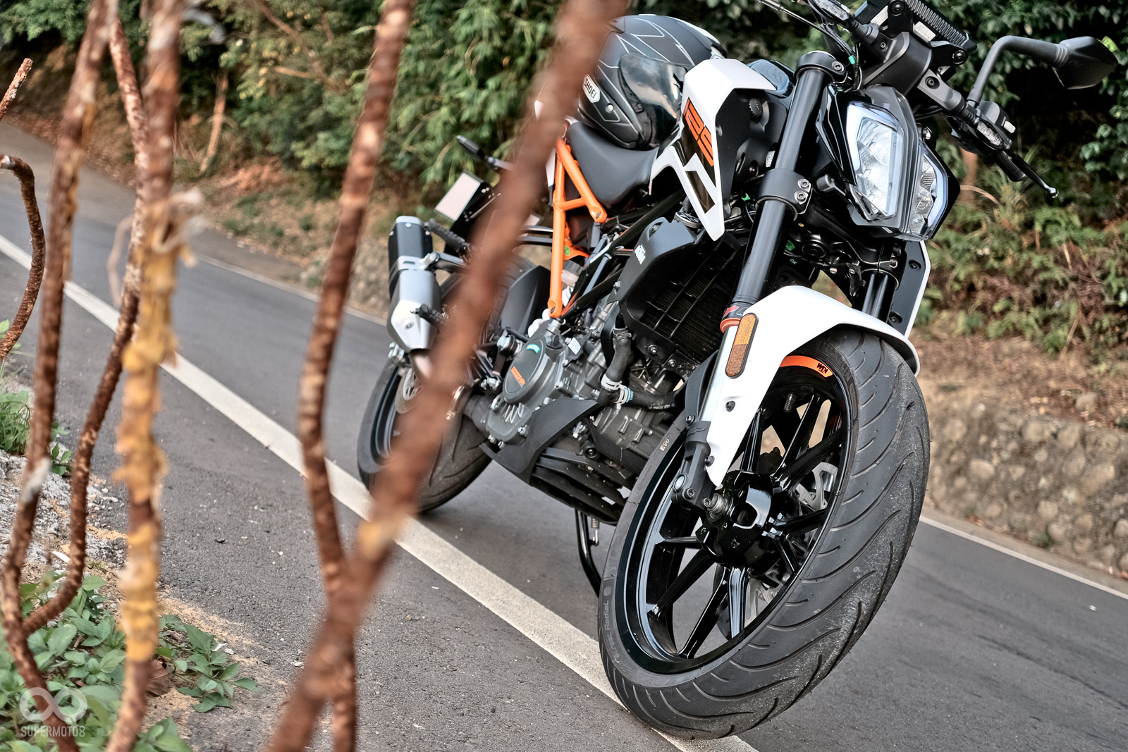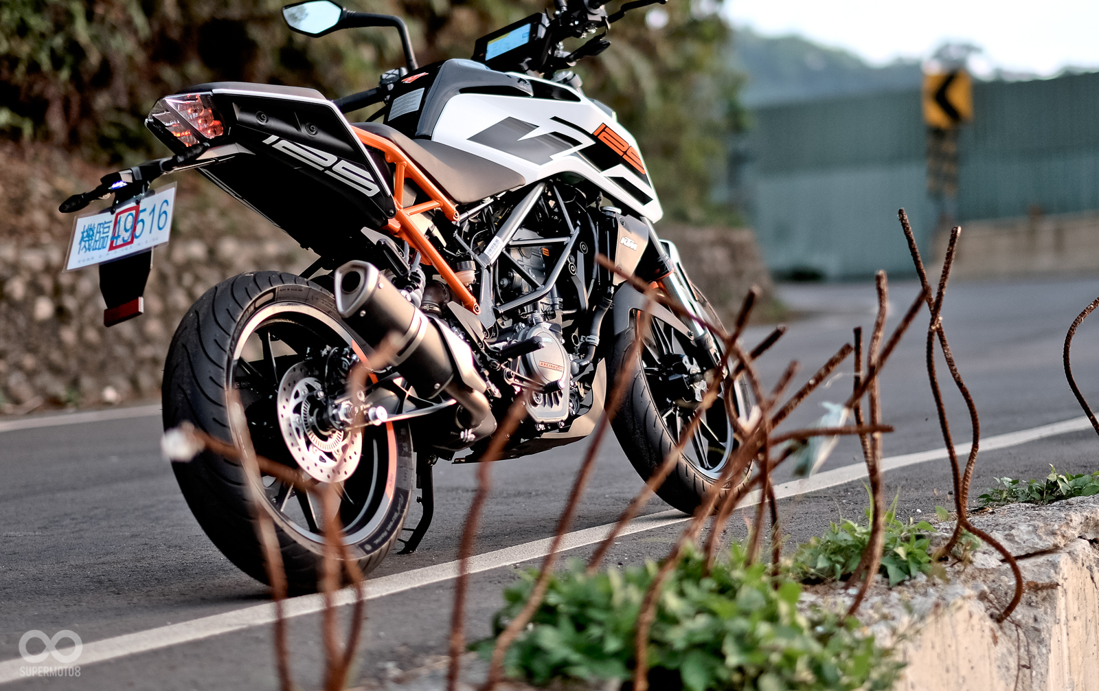 在高轉速的情況下煞車、退檔補油,耳邊傳來些許的排氣管放砲聲,在彎中保持中高轉速帶後出彎開油,轉速毫不拖泥帶水的往上衝,轉速會延伸至將近12,000轉的斷油點,並帶領騎士攻入下一個彎角,值得一提的是,如果有騎過390車系的讀者一定會對胯下的高溫印象深刻,原以為排氣量降至125c.c.會減緩這輛車的火氣,但是對於台灣走走停停的夏季市區,KTM 125 DUKE的熱情依舊難以抵擋啊!