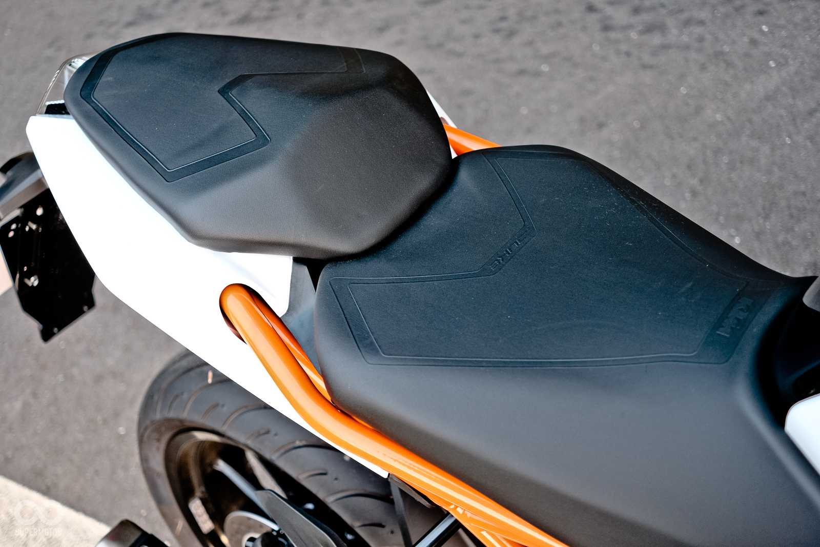 跨上125 DUKE,雖然排氣量降為124.7c.c.,但是830mm的車高確實讓人有點擔心,幸好單缸的苗條車身讓騎士大腿不至於過度擴張,坐墊削切的角度相當銳利,前窄後寬的設定讓身材較小的騎士可以透過坐姿前移確保雙腳穩穩地放在地上,車輛啟動後將屁股向後挪動,加寬的左右兩側配上偏硬的泡棉有著良好的支撐性,加上高聳的把手,“坐姿端正”的騎姿在筆者單趟騎乘將近一小時的路程中可是相當輕鬆。