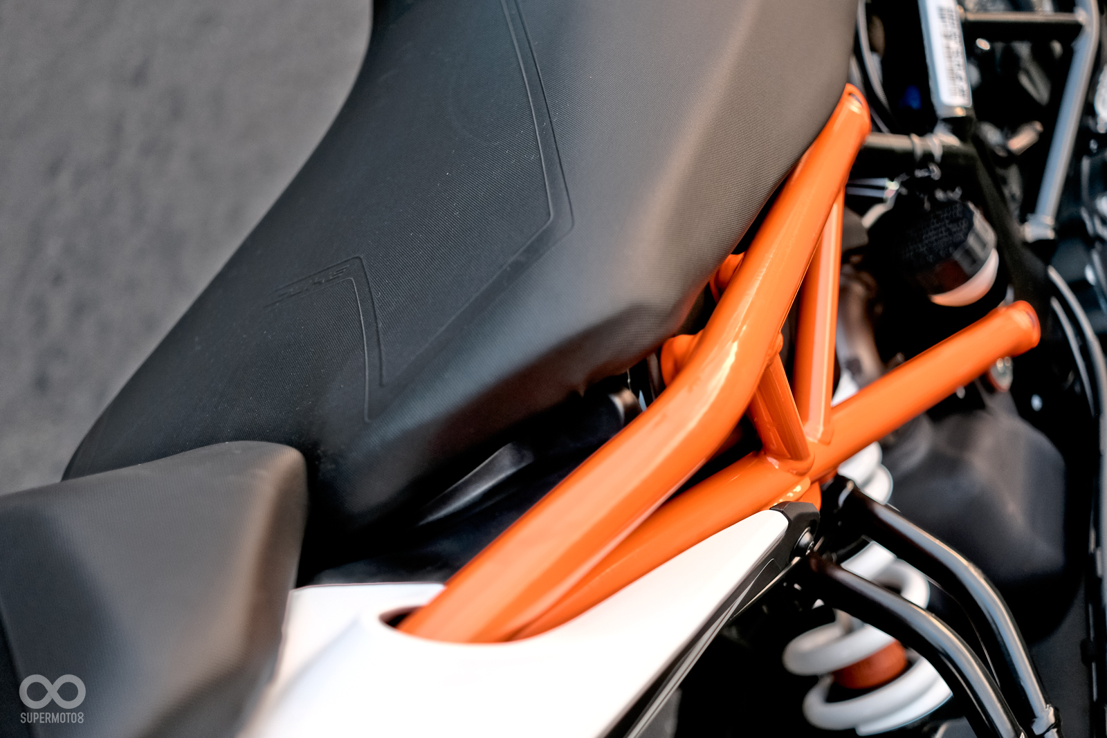 43mm前倒叉絕對是125 DUKE的重點之一,雖然重煞車的情況下感覺懸吊略軟,但車輛在彎中依舊有良好的穩定性,配上同樣由WP代工的中置避震器,整體表現帶給騎士很快速的傾倒反應,加上優異的編織車架剛性,一攻入彎角可以帶給騎士相當大的安定感,對於應付台灣車輛密度高的市區或是連續彎的山道騎乘都相當合適。