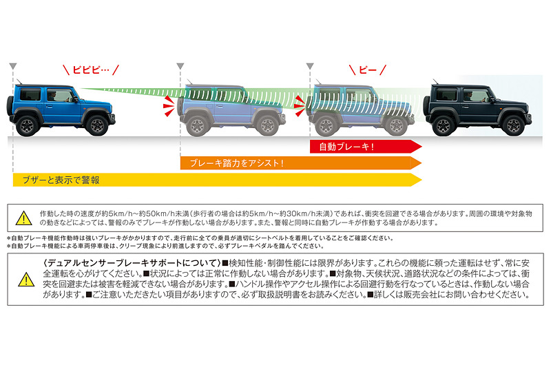 不過這一代的進步可不是只有內外觀的改變而已,再主動安全配備上竟然有著全面性的提升,搭配上Dual Sensor Brake Support主動煞停系統,擁有紅外線攝影機與雷達感知,不僅可以偵測車輛與障礙物,更可以偵測行人,發揮極佳的安全性,加上車道偏移系統、遠近光燈切換系統......等多項現今車款流行的配備全都搭載,讓Jimny就算日常使用也非常方便。