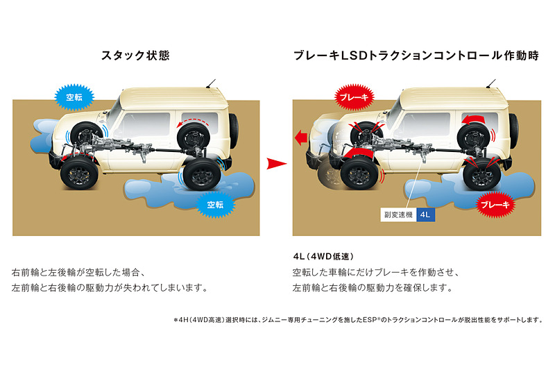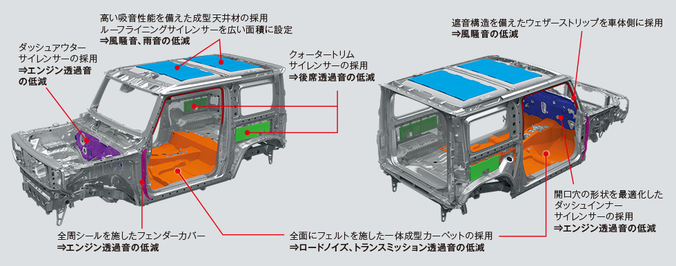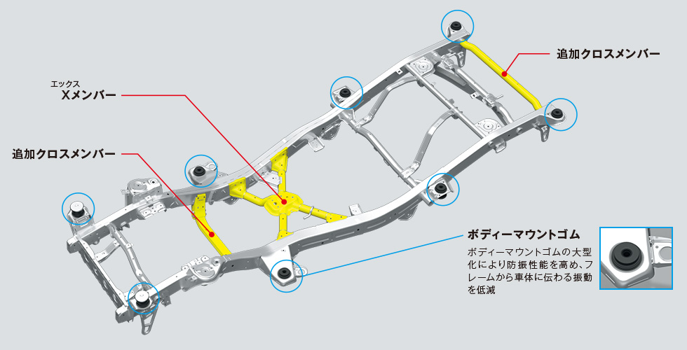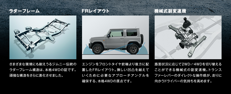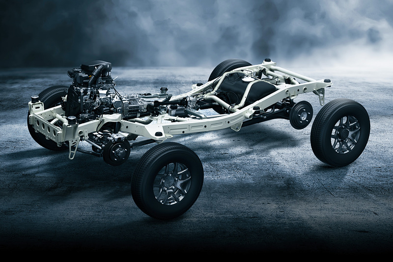 在講到動力之前,以越野來說更重要的就是底盤了,底盤依舊維持著階梯形大樑設計,保有更強的越野性能,除了4WD的配置之外還有加力箱的設計,以及三連桿固定軸的懸吊系統都跟上一代的Jimny相同,不過這次在車架上加入了強化結構的設計,前後也都加入了橫梁讓車身強化,不過在底盤強化之後為了要讓車內的舒適型不要太差,在所有與車殼連接的地放都用上了橡膠減震,在一般狀況的駕駛下可以更加輕鬆。