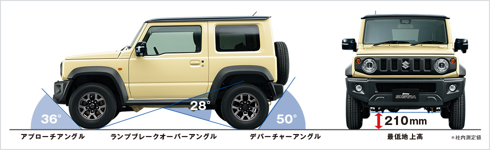 Jimny的車身尺碼為3,395 × 1,475 × 1,725 mm(長×寬×高),離地高度為205mm,而Sierra則為3,550 × 1,645 × 1,730 mm (長×寬×高),離地高度為210mm,兩者的軸距都是210mm,不過除了尺寸上的不同之外,Sierra也配上了較寬的輪胎,但是在越野能力方面,Jimny比起Sierra好一些些,Jimny 的接近角為 41度、通過角為28度、離去角為51度。Sierra的接近角則為 36度、通過角為28度、離去角為50度。