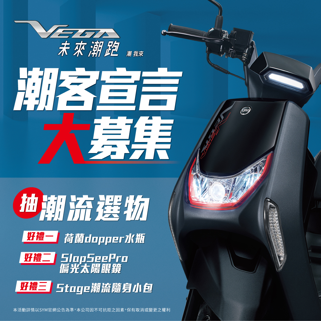 即日起至8/31,凡購買VEGA車款,即享潮流好禮三重送