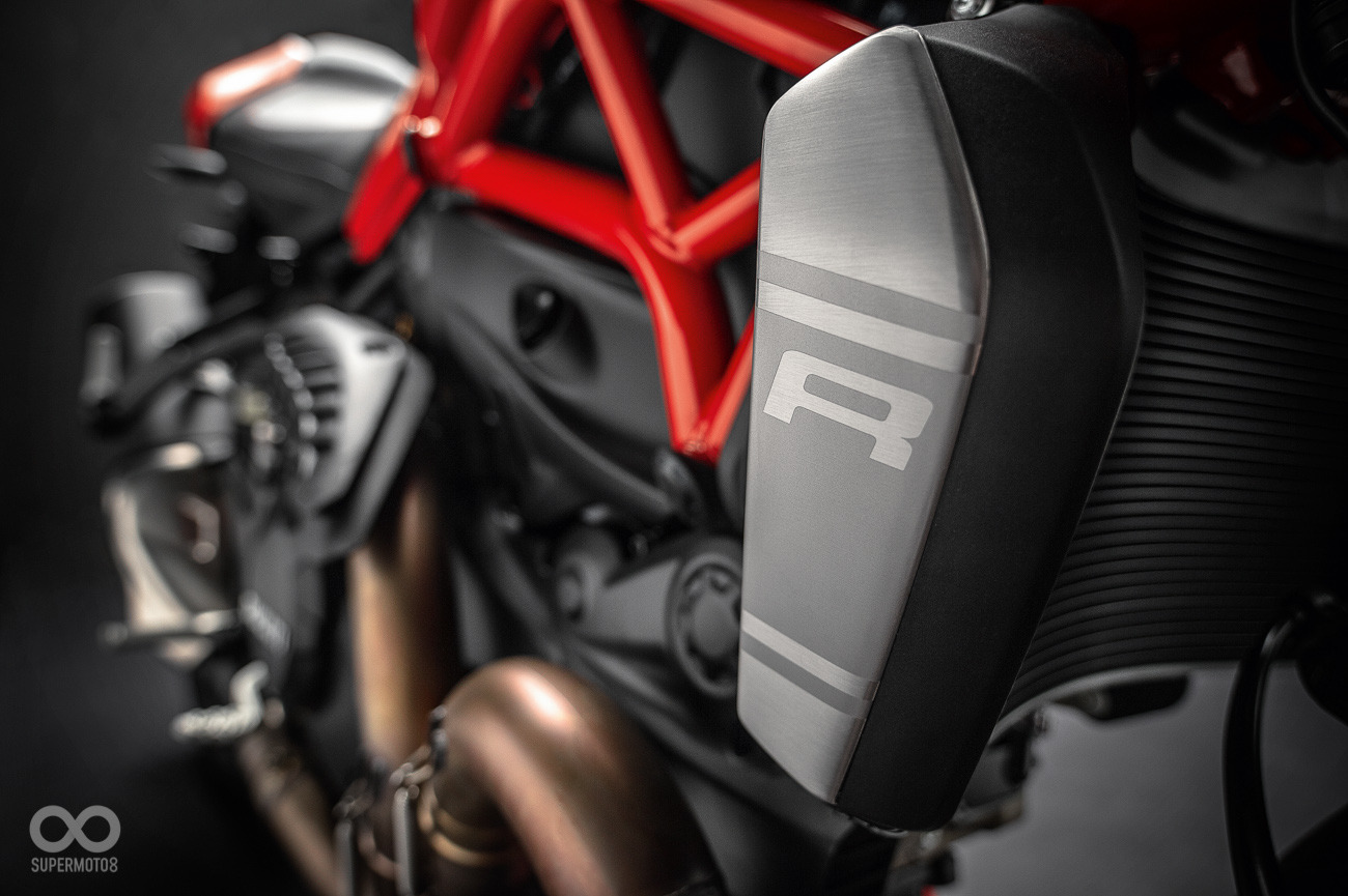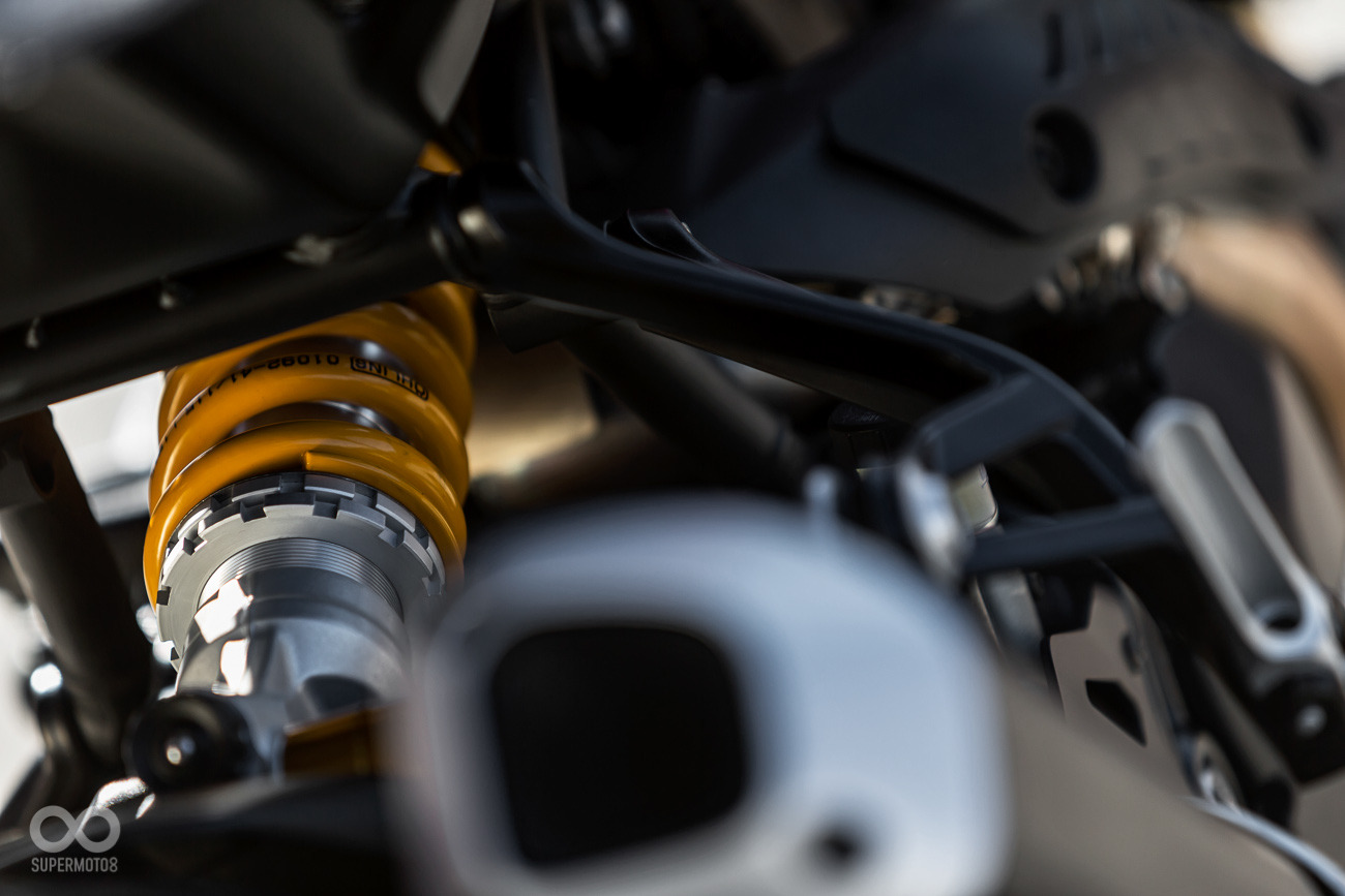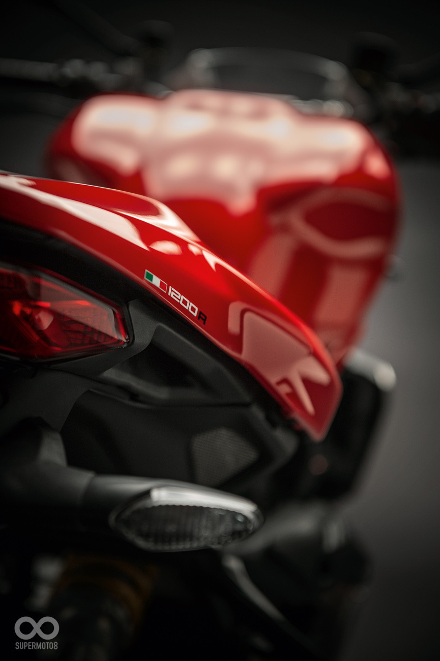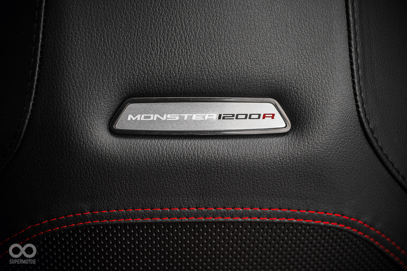 對應更強悍的性能,Monster 1200 R騎乘姿勢、懸吊與煞車系統也全面強化。因副車架造型的調整,後座提高2cm,搭配全新前後腳踏板設計,騎乘姿勢將更具戰鬥性。導入全新Ohlins前後避震器,採用氮化鈦塗層鍍色,黑金配色為車身外觀造型帶來全新亮點。除了煞車系統導入Brembo M50四活塞輻射卡鉗,對應前330mm、後245mm碟盤直徑,配上Pirelli目前運動胎旗艦Diablo Supercorsa,前後輪胎尺碼分別為120/70 ZR17與200/55 ZR17。同時,Monster 1200 R也導入了Ducati安全套件,包含循跡系統、提供Sport/Touring/Urban三種等級的騎乘模式等。